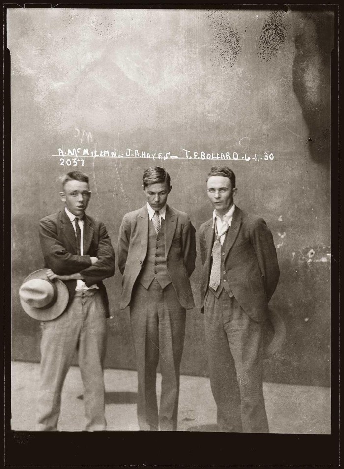 Eddie McMillan, John Frederick 'Chow' Hayes, Thomas Esmond Bollard, Special Photograph number 2057, 6 November 1930, Central Police Station, Sydney. Source: Sydney Living Museum (Justice & Police Museum).