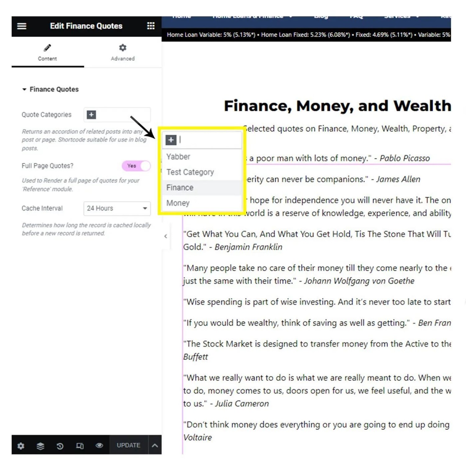 1. Create a page on your website with all or selected quotes. Supported by an Elementor Widget, the page is actually hidden from all navigation. If you wanted to use it, you will need to add it to a menu (of the 230+ pages, this is one of about 30 that is hidden). You may optionally include a single quote on any page.