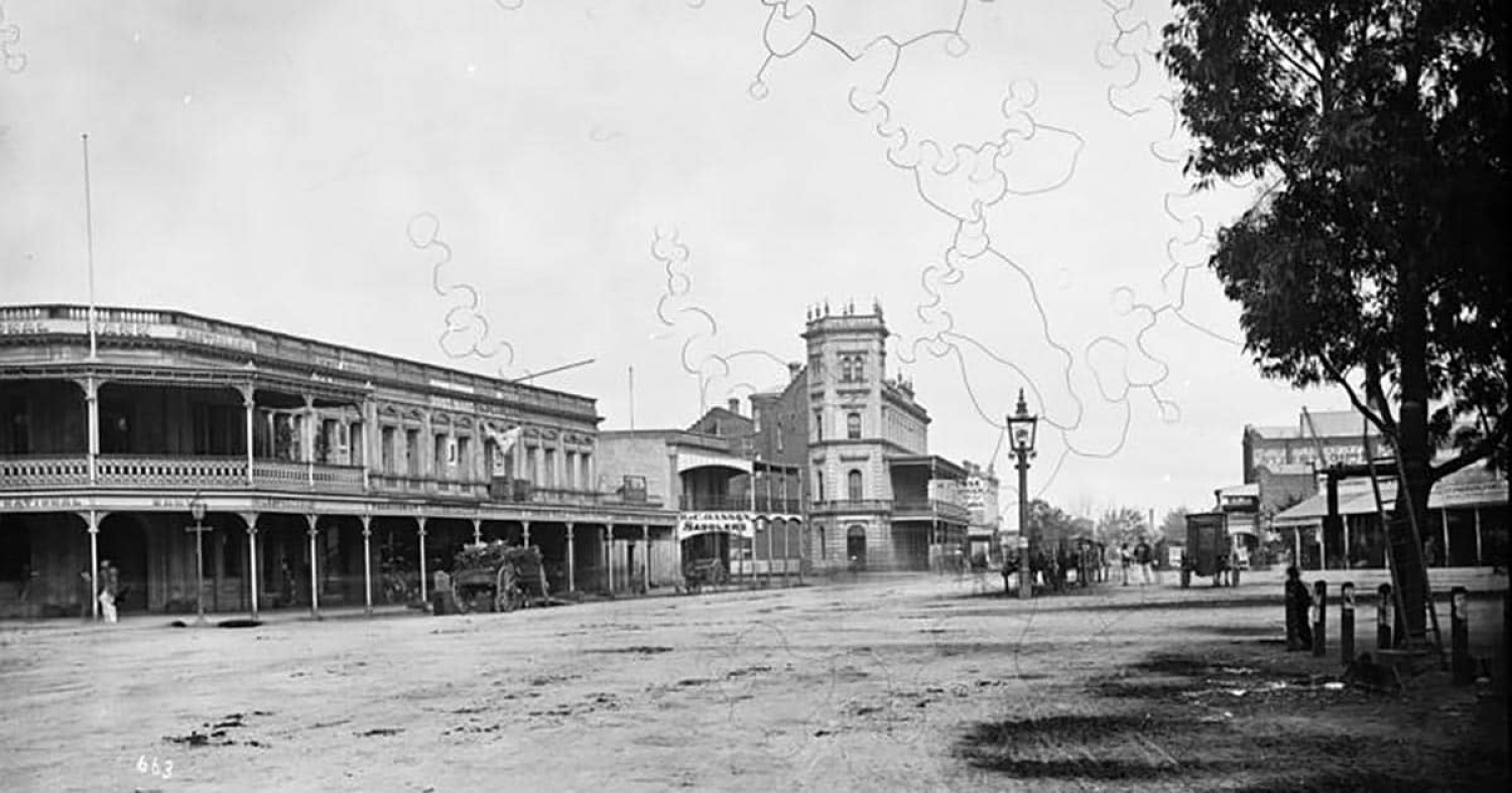 National Bank of Australasia, R.C. Hansen's saddlery, and the Shamrock Hotel, Sandhurst (Bendigo), c1872. The National Bank of Australasia was a bank based in Melbourne. It was established in 1858, and in 1982 merged with the Commercial Banking Company of Sydney to form the National Australia Bank.