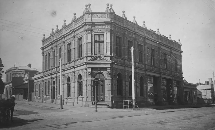 National Bank of Australasia, corner of Walpole and High Streets, Kew, Victoria, c1895. The bank was built in 1888. The two north-eastern bays facing High Street were subsequently demolished in the second half of the 20th century. The core of the bank remains as an NAB branch today.