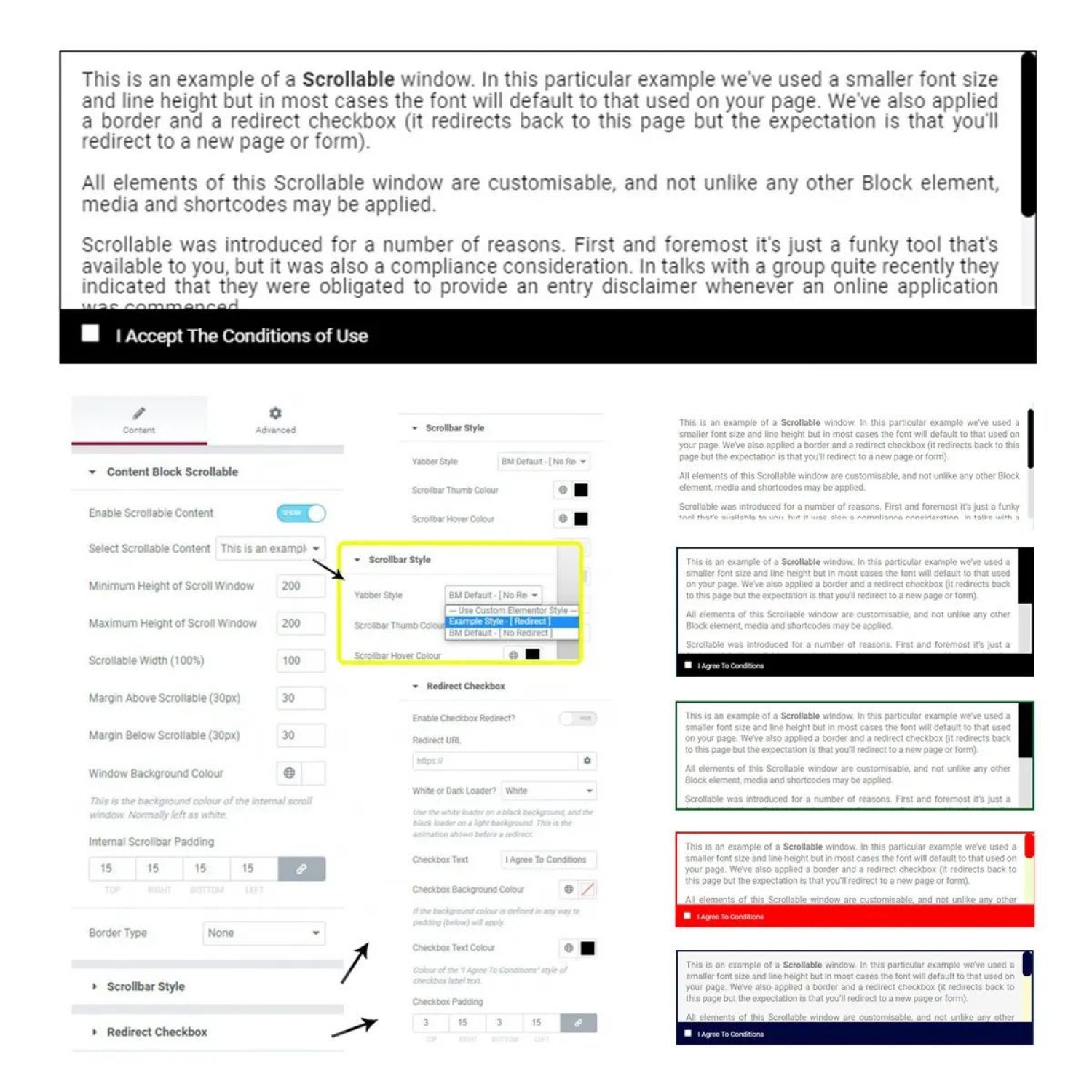 We've created a ridiculously simple Elementor block that shows Yabber 'Block' content in a scrollable window. There's an option to include a checkbox that redirects the user to another page. The feature is customisable in every respect.