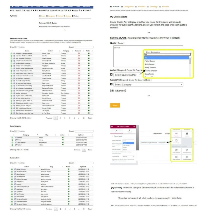 We've created a ridiculously simple module in Yabber called 'Quotes'. The module permits the creation of your own Quotes library (with the option to import a few hundred financial quotes from Yabber's library). These quotes are made available on your website via the use of a drag-and-drop Elementor widget or with the use of shortcode. Both methods permit the option to filter by author or category. You may also render all quotes into a single SEO-hungry page.