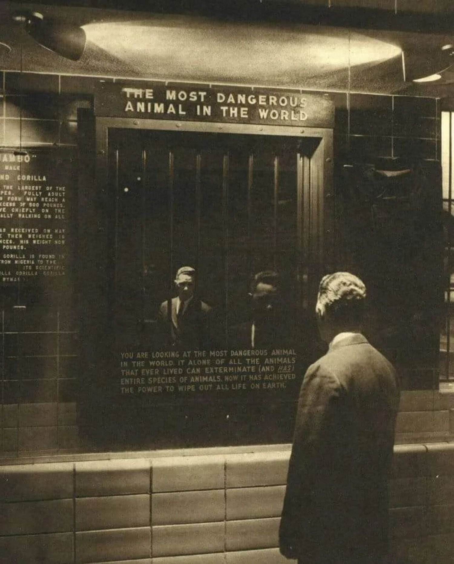 An exhibition at the gorilla house at New York City’s Bronx Zoo, 1963. The caption reads: “You are looking at the most dangerous animal in the world. It alone of all the animals that ever lived can exterminate (and has) entire species of animals. Now it has achieved the power to wipe out all life on earth.”