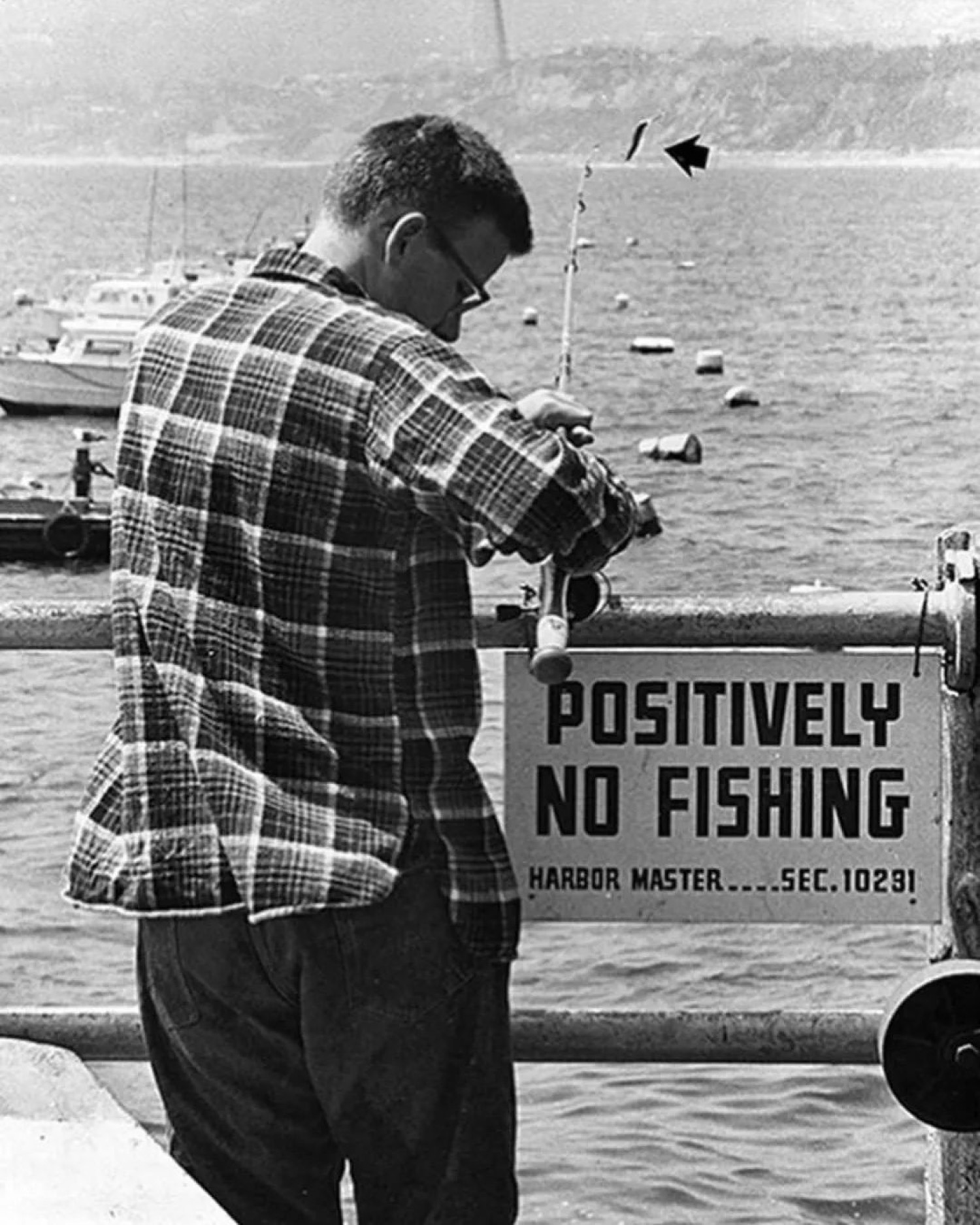 *Positively No Fishing". Santa Monica Pier, 1964. Back when 'positively' was a stern word. Photo by Steve Young.