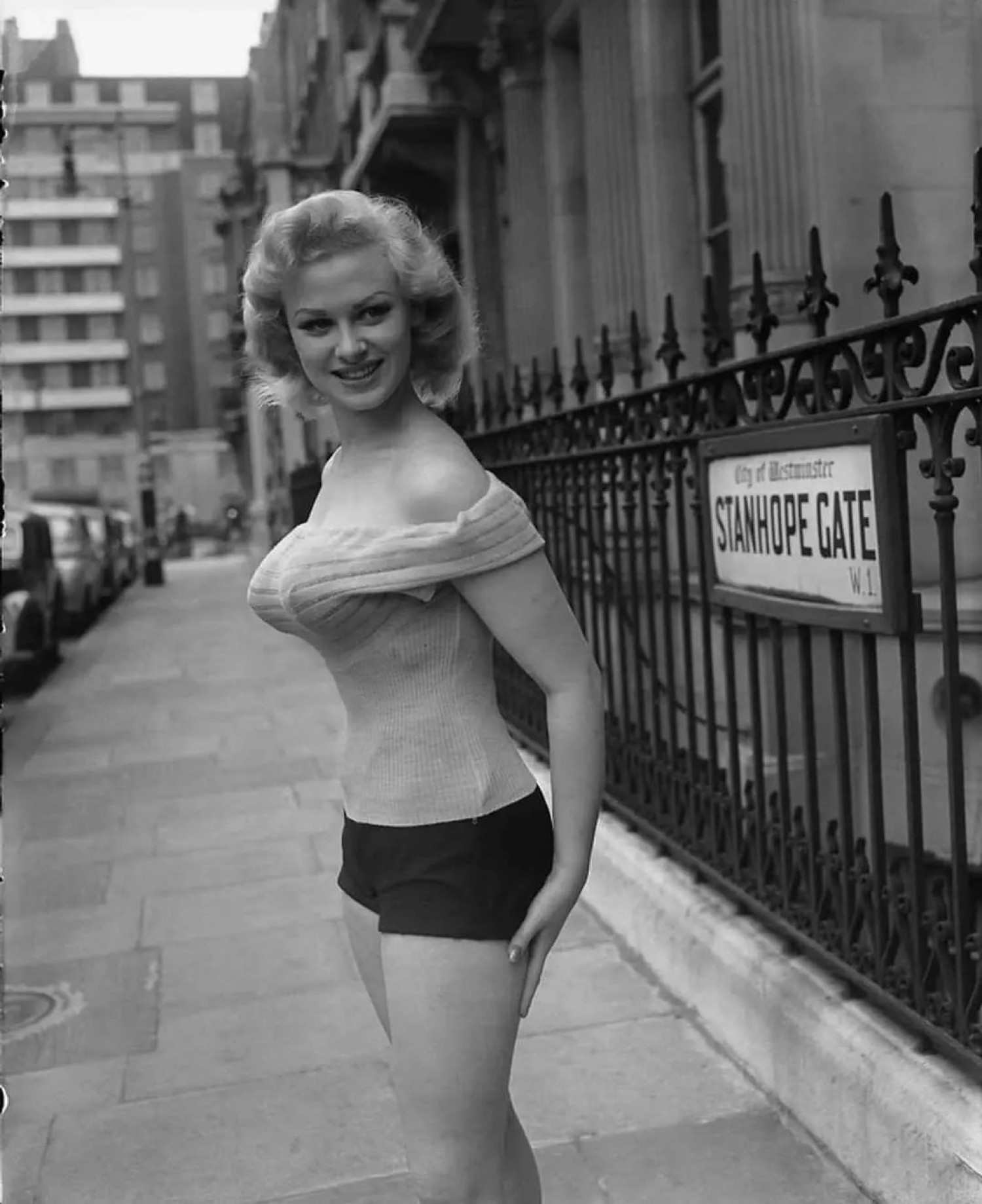 She is pictured at Stanhope Gate near Park Lane on the 24th June 1955 as part of a photoshoot to promote her upcoming music hall tour in which she would be topping the bill in London, the Midlands and the North.