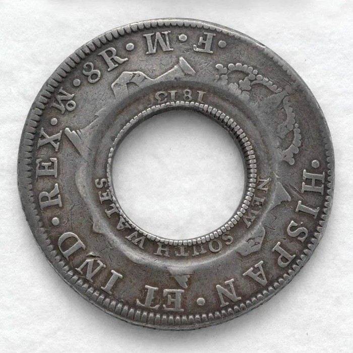 On the 30th September 1813 the 'holey dollar' and 'dump' coins became legal tender in NSW. Governor Macquarie faced currency shortages soon after his arrival in the colony. The British Government bought 40,000 dollars worth of Spanish coins in India and sent them to NSW in 1812. Macquarie commissioned convict forger William Henshall to cut the centre (the dump) out of each coin and stamp them with NSW. The smaller 'dump' was worth fifteen pence and the larger 'holey dollar' (with a hole in the centre) was worth five shillings.