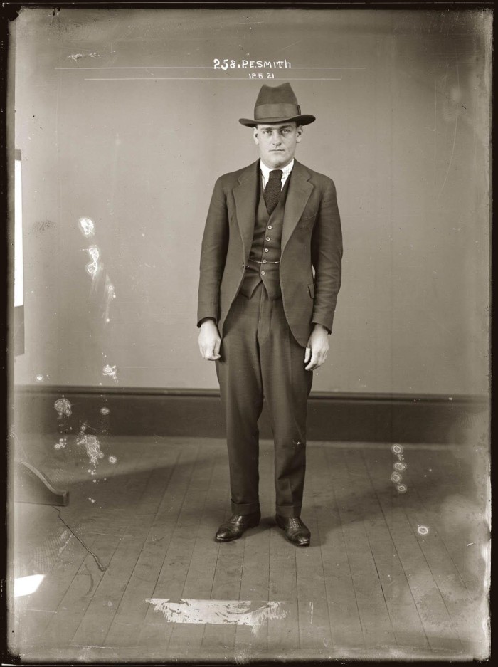 Special Photograph no. 258. Details surrounding this particular photograph are unknown, but P E Smith appears frequently in police records of the 1920s. His photo appears in the Photo Supplement to the NSW Police Gazette of 1 August 1923 p. 12, captioned 'Assault and robbery.' A mention Photo Supplementof 19 October 1927 has him as a '[p]ickpocket and confidence man.,' who '[f]requents metropolitan and country racecourse meetings in the various states.' Yet another entry, in the Supplement of 18 April1928 (group 1 p. 2) is captioned, '[i]nterstate pickpocket and bogus agent. Frequents dance halls. Dresses well. A native of Queensland.' Smith was also profiled in exposes in the newspaper Truth in 1928,as a 'go-getter', ie a con man who sells suburban building blocks at grossly inflated prices, by falsely leading the buyers to believe the lots may be promptly resold for a huge profit. See also 'Mug shotWalter Keogh'.