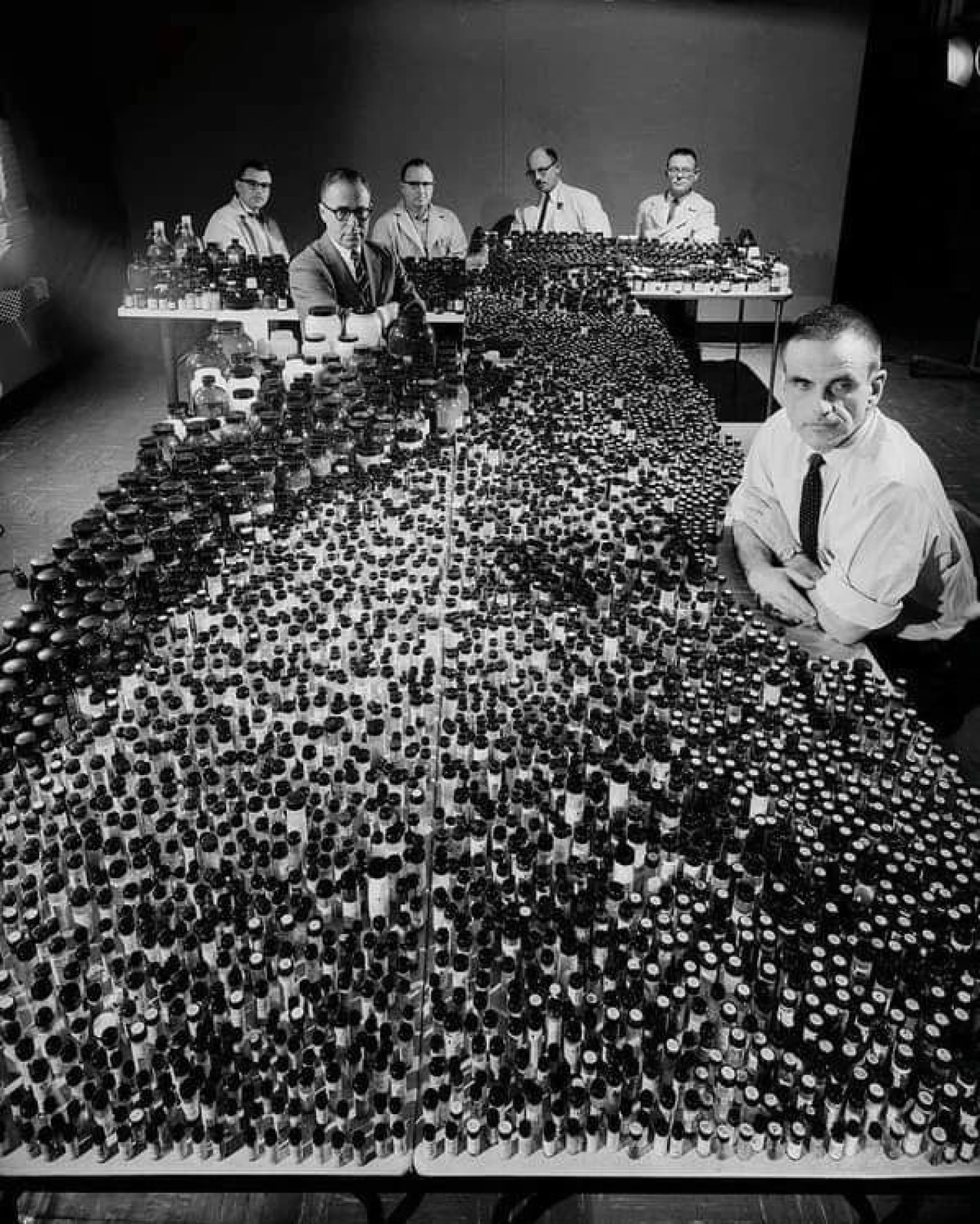 Polaroid chief chemist Howard G Rogers and unidentified others as they pose with 5,000 bottles of chemical compounds used to discover the Polaroid color film process, 1963.
