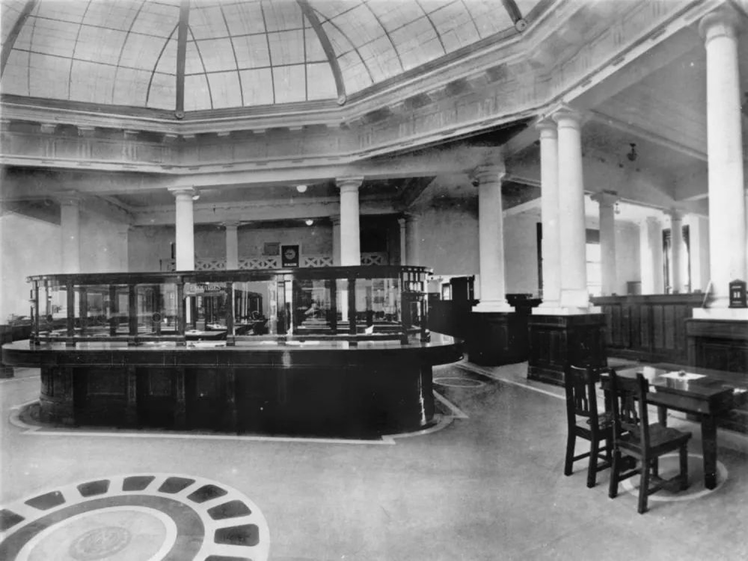 Interior view of the Queensland National Bank, Queen Street, Brisbane, 1922. View of the main banking area (known as the 'Banking Chamber') showing the teller's cages, counters and tables. The domed roof is supported by stone columns and a circular feature is imbedded into the floor at the entrance.