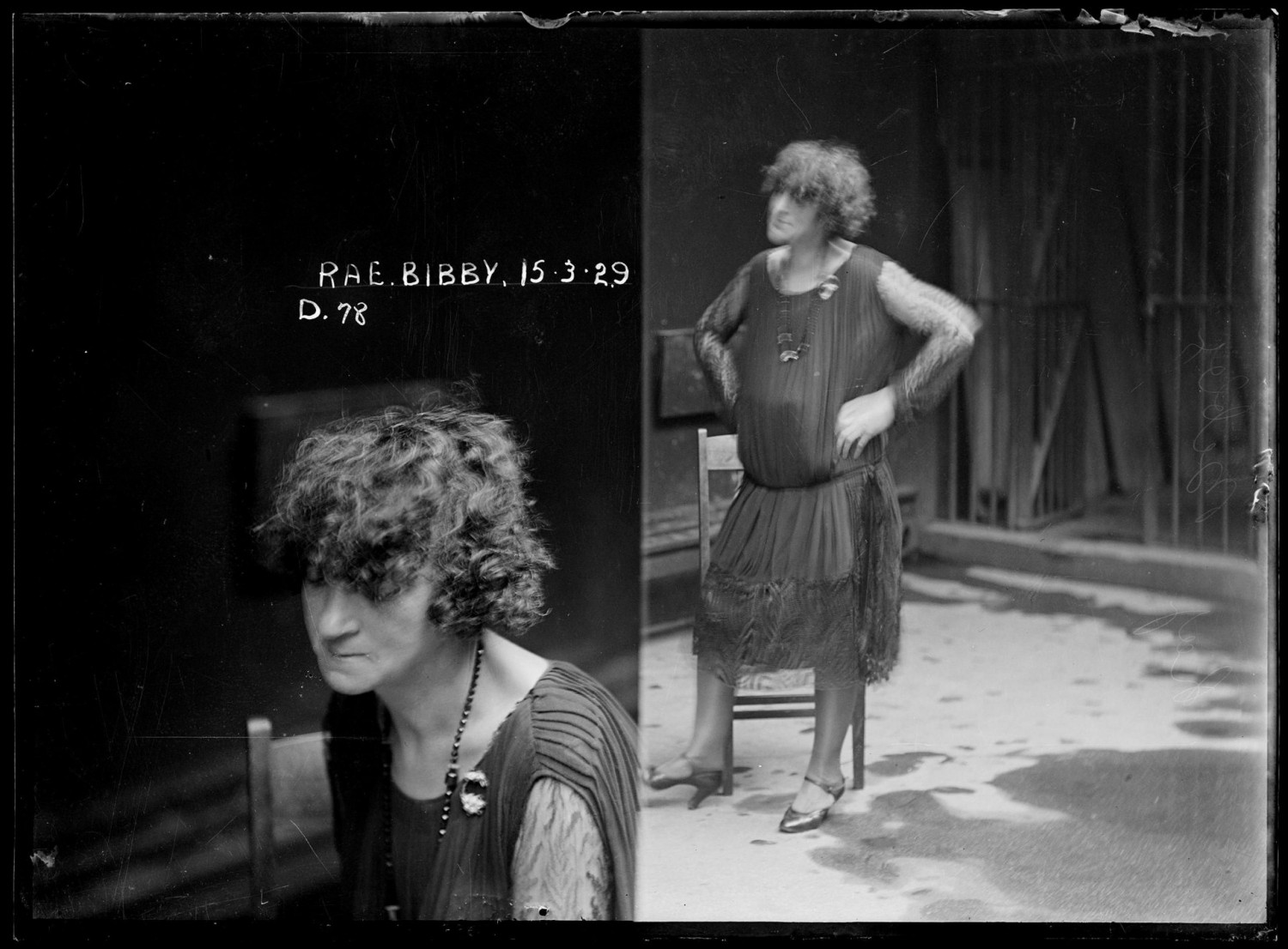 Titled "Rae Bibby, Special photograph number D78, 15 March 1929, probably Central Police Station, Sydney."