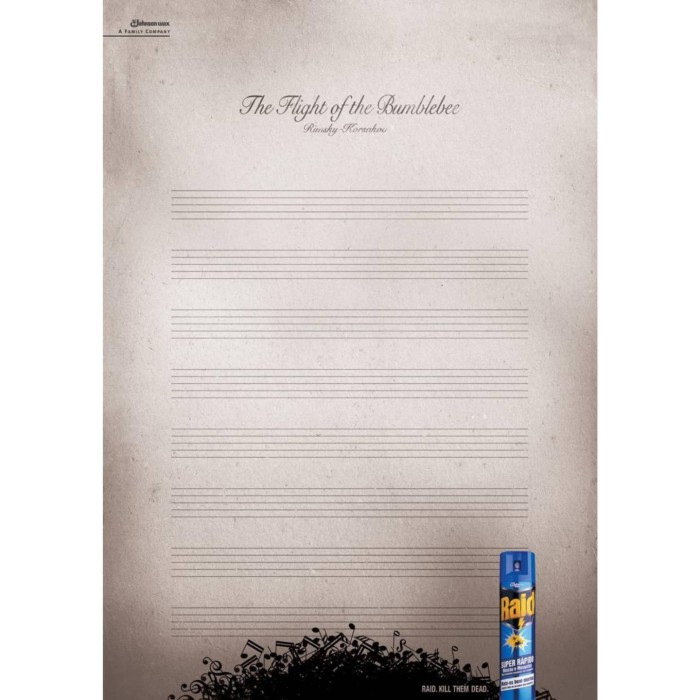 An advert for RAID bug spray from April 2007. Nikolai Rimsky-Korsakov’s orchestral interlude Flight of the Bumblebee is used to demonstrate the effectiveness of the product.
