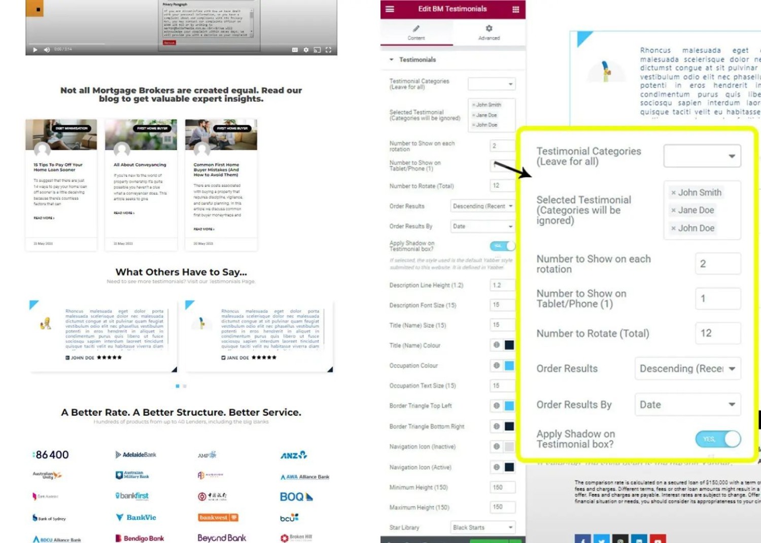 The testimonial panel slides between those reviews that are specifically defined, or all reviews. The number of reviews shown, colours, timing, and other elements are all customised to your liking. Note the two blue squares below the slider - these are fully customisable button for pagination (you may also disable pagination entirely).