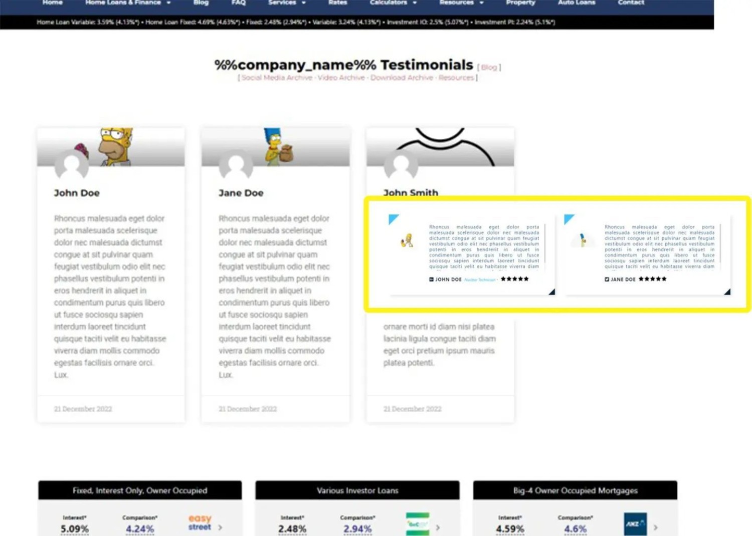 A 'Black' and 'Gold' style applies to the star rating, with the latter typically used just about everywhere. Before the name of the individual that supplied the testimonial you'll see a small icon that shows where the review originated. The 'Occupation' field shown in the first pictured review is only available when that review is provided by Yabber.