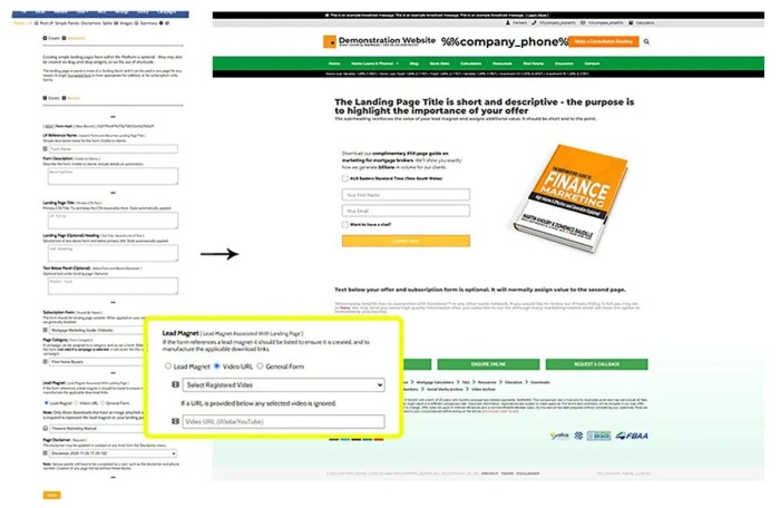 The Yabber landing page creation panel and an example landing page. The example page we've created isn't an ideal example because we haven't removed the header or footer - this is expected default behaviour on client websites. We have also included only minimal text. The inset shows how to select between lead magnet based pages, video pages, or other pages, such as fact find or Venus reports.