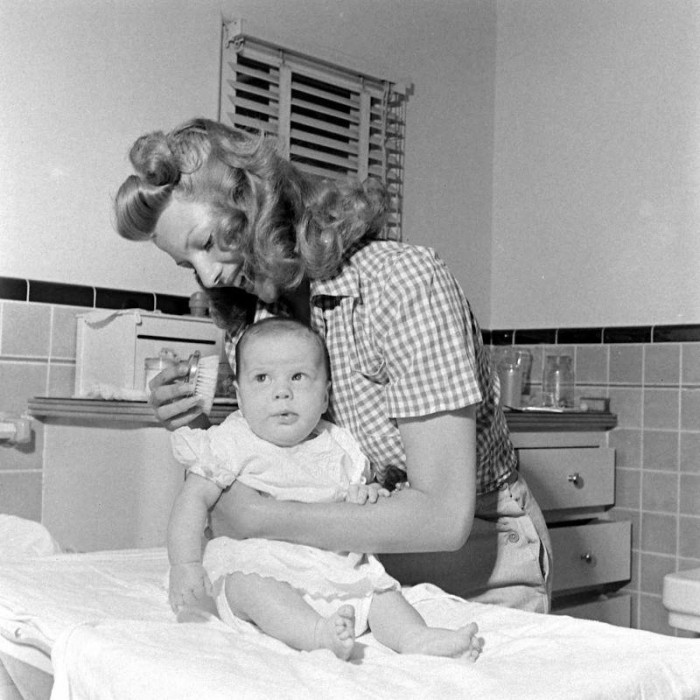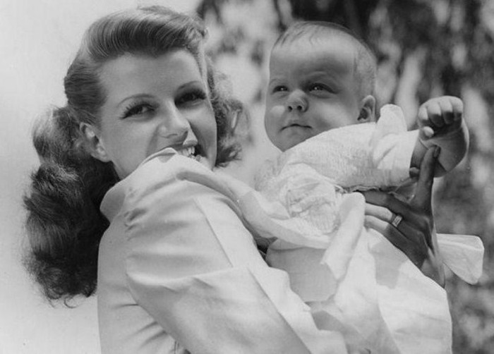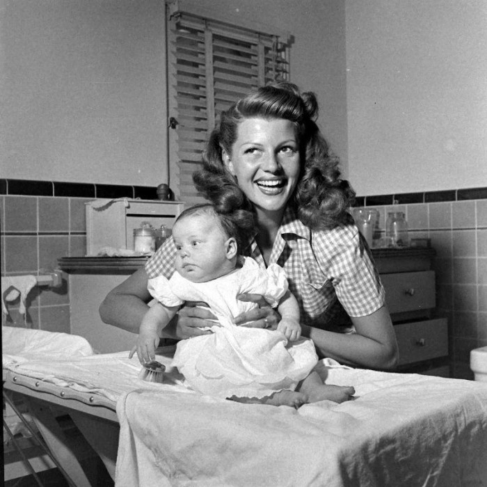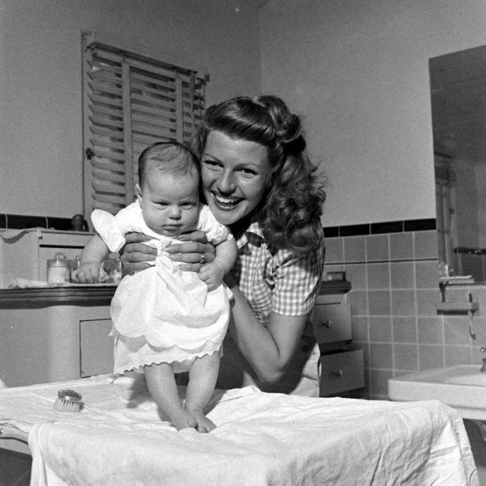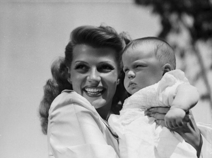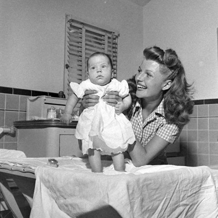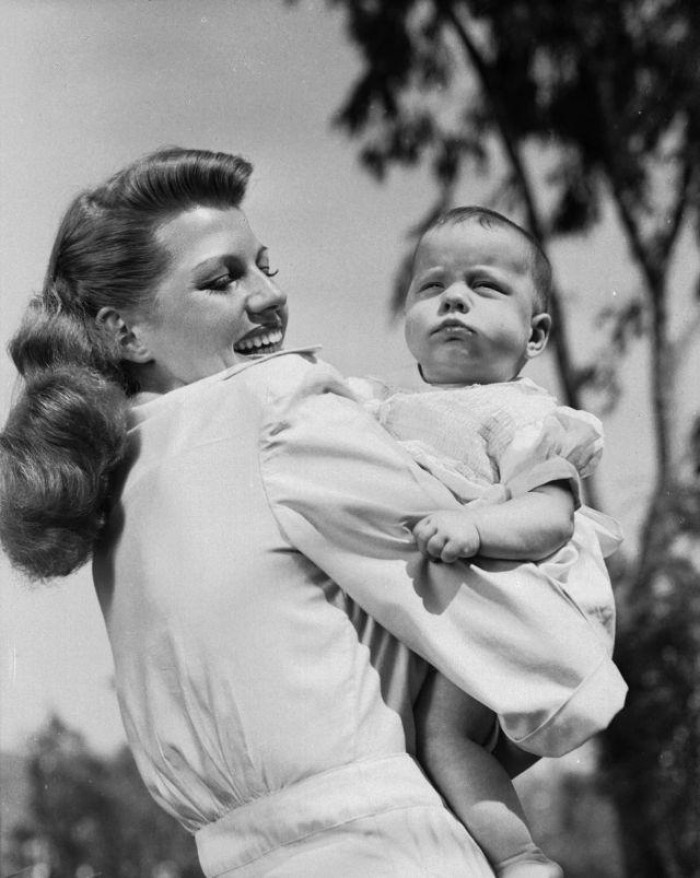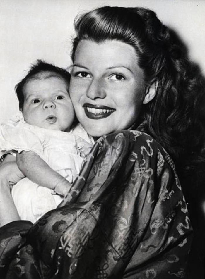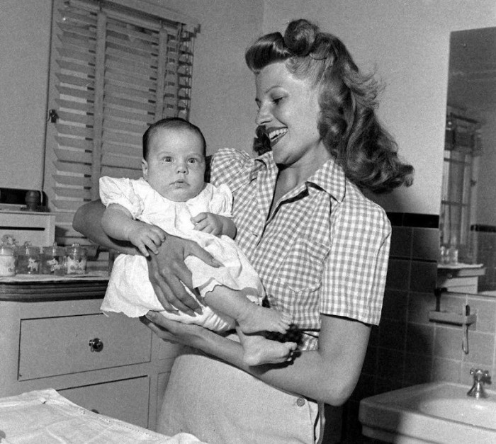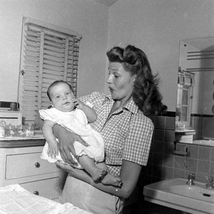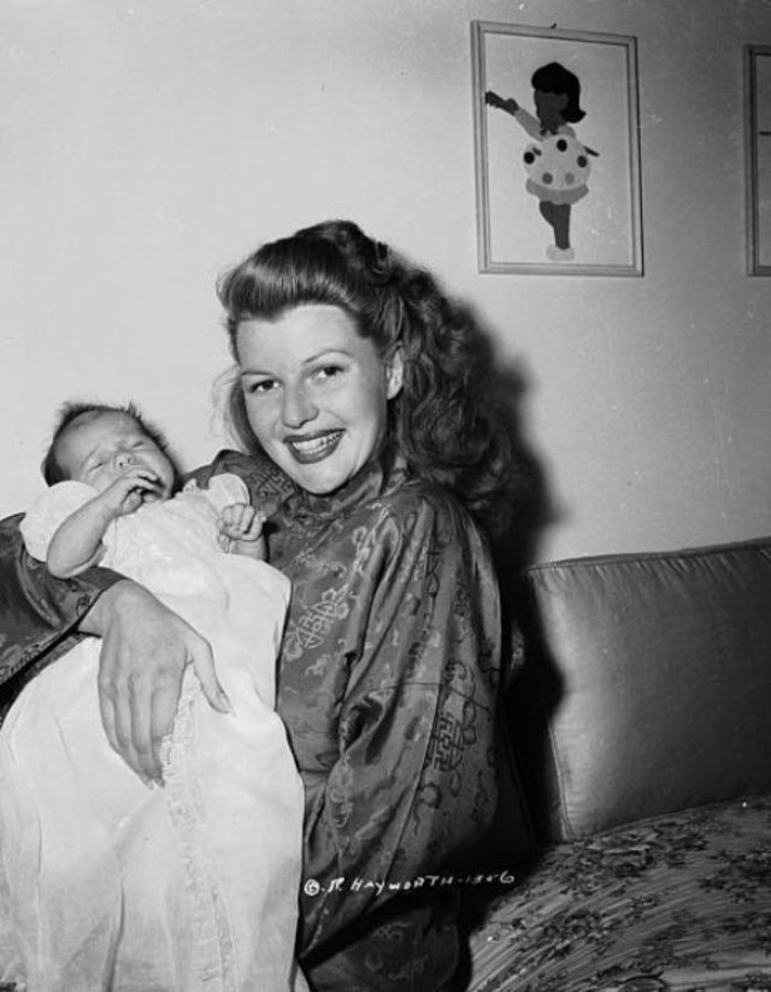 Rebecca Welles, born December 17th, 1944with her mother, Rita Hayworth, as she makes her first camera appearance at home in Beverly Hills, Hollywood, CA on January 20th, 1945.