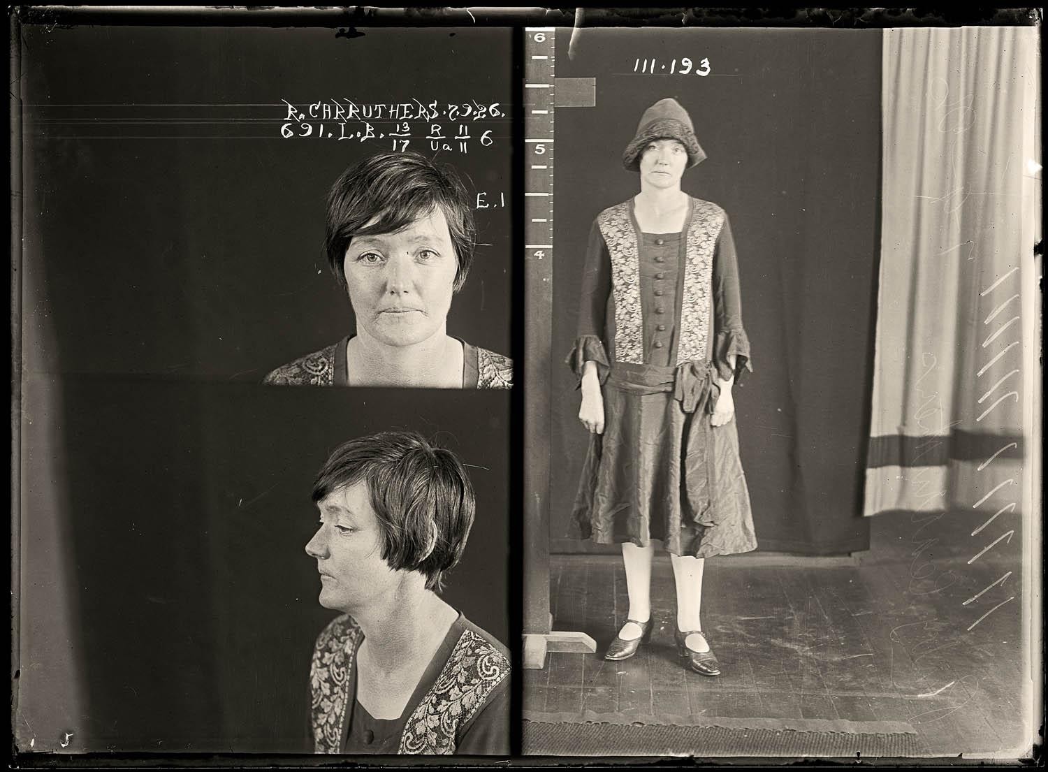 Convicted of false pretences. Ruth Carruthers went on a criminal spree in 1926, using the art of persuasion to obtain goods and money from hapless shopkeepers. She was eventually convicted on four charges of false pretences and sentencedto six months at Long Bay. Aged 28. Part of an archive of forensic photography created between 1912 and 1964.