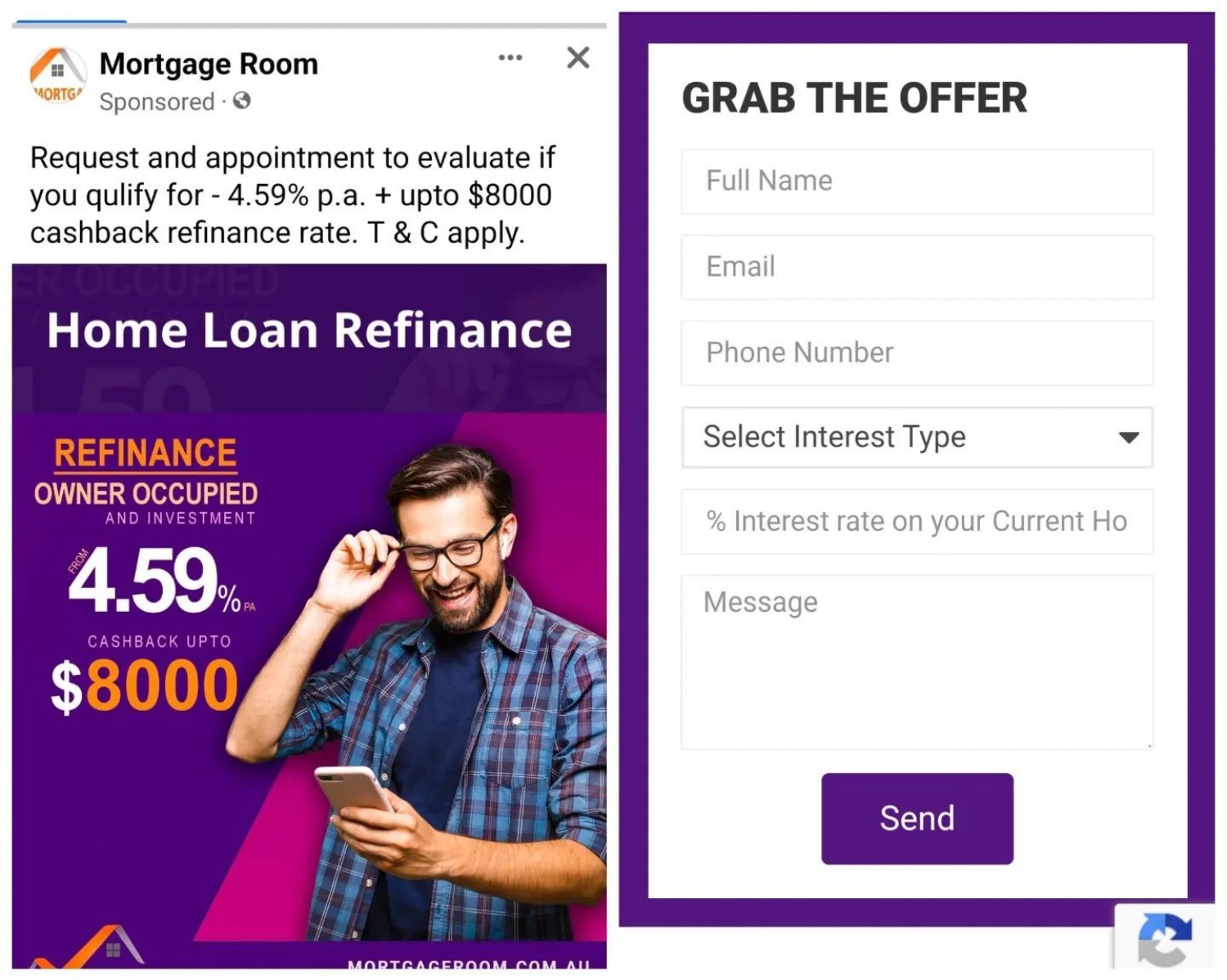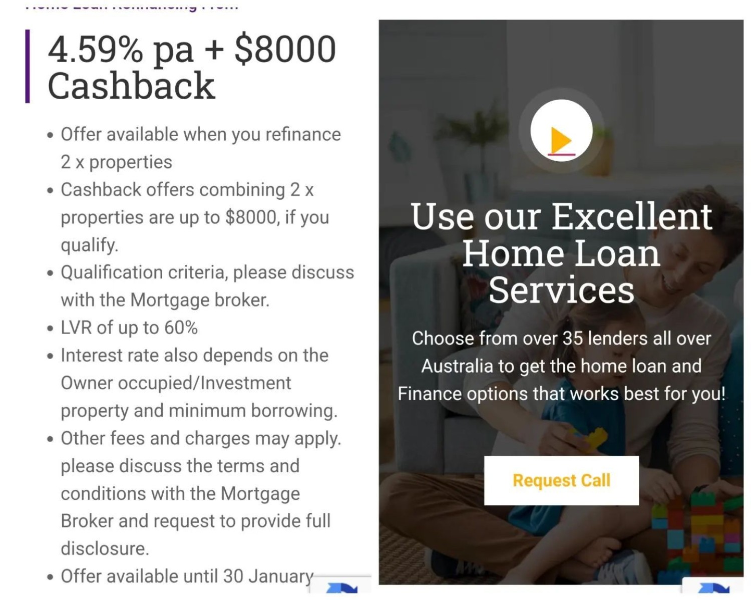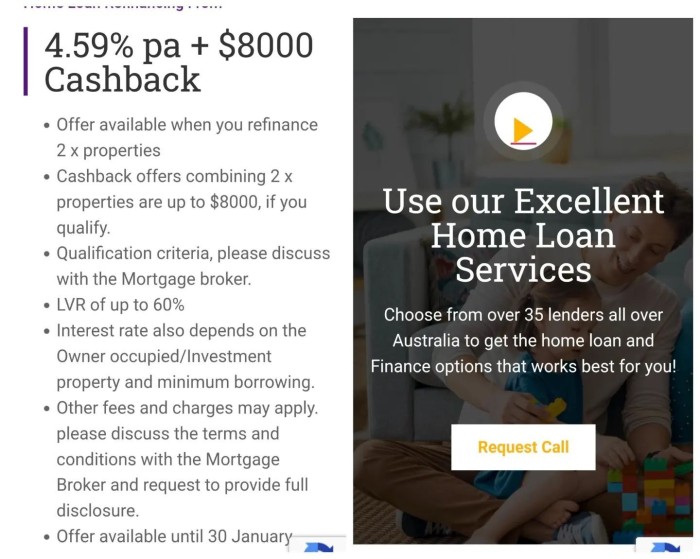 The ad fails to provide the comparison rate, and the broad cashback headline is available to around 0.7% of the population. Both are quantitative statements that require disclaimers.