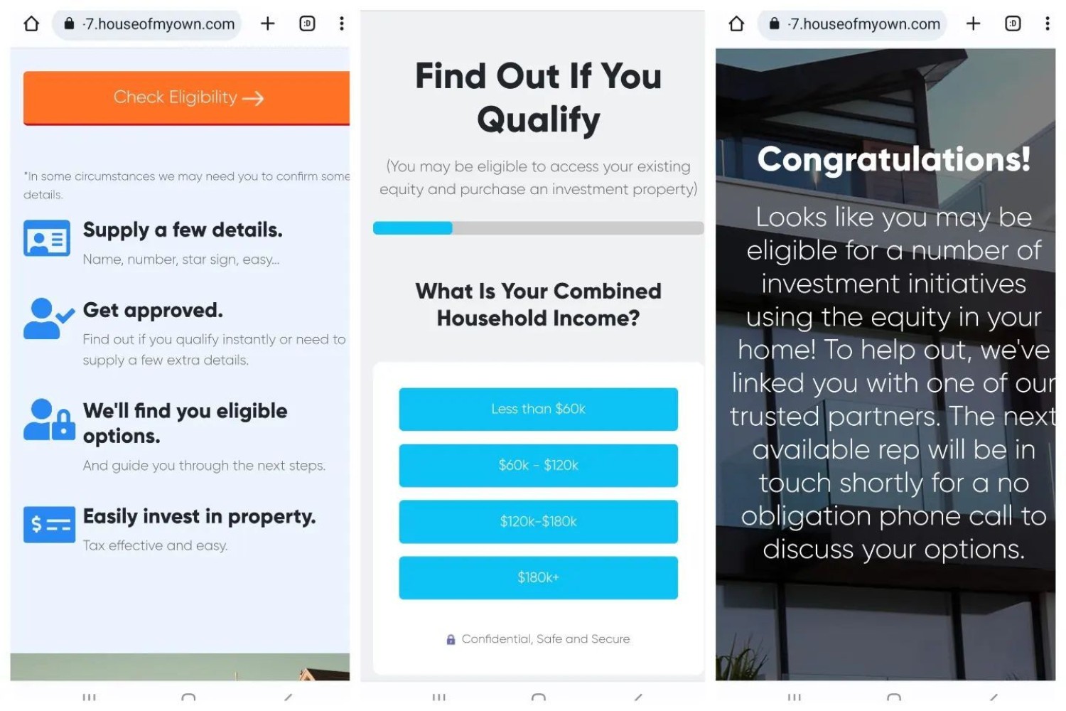 The ad claims to 'qualify' users... yet it does nothing of the sort. In fact, regardless of what details I supplied I was delivered the same congratulatory message. There's a name for this - baiting. And it's illegal. in fact, claiming to 'qualify' somebody is also illegal - particular when the form doesn't resolve anything. Claiming that you'll provide 'results' of some kind when nothing is actually returned is also illegal in the finance space.