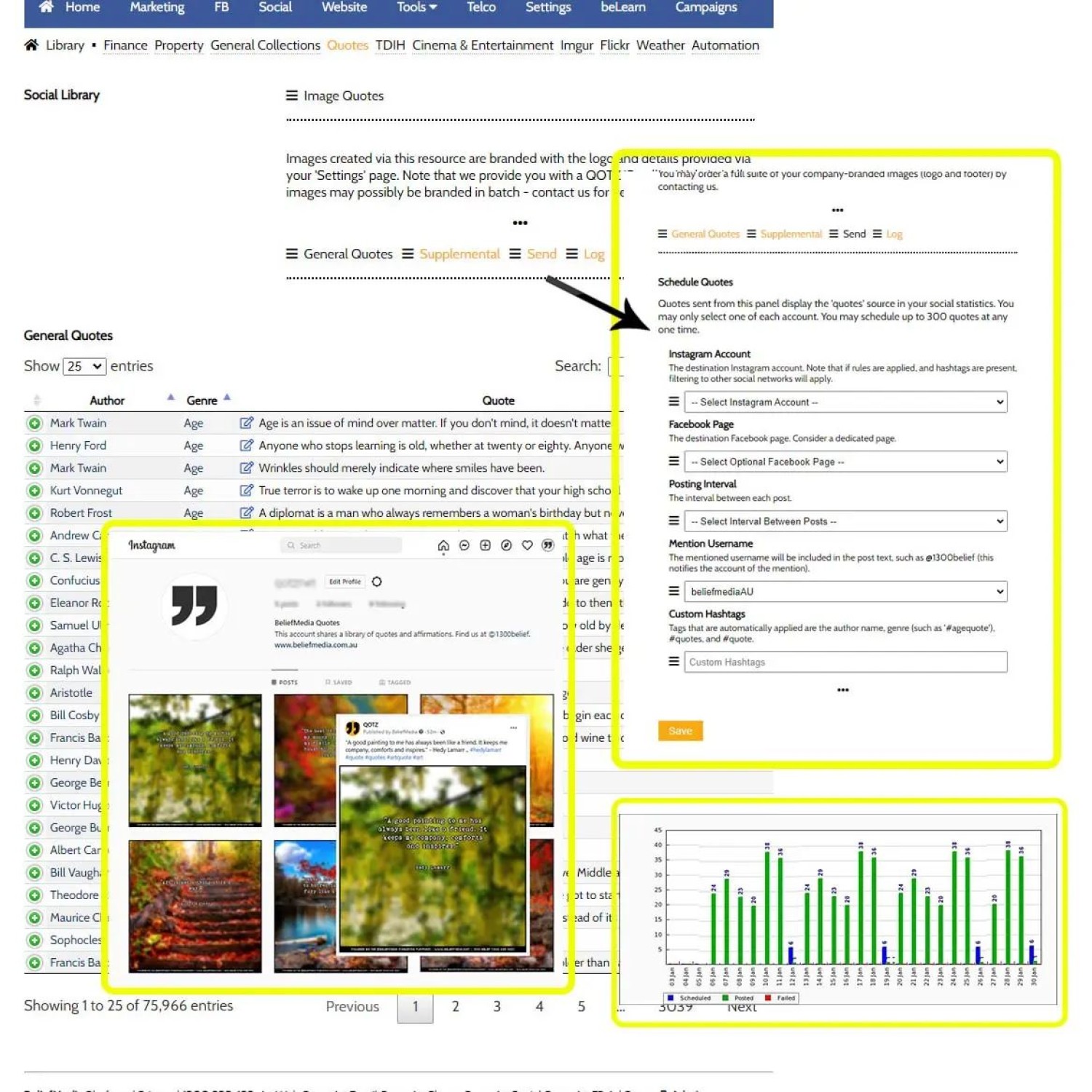 One of the featuresof Yabber is the social media library. Supplementing our managed social service is a backend of content you may schedule to any number of social accounts. Part of this library (and quite frankly one of the most pointless) is a library of image quotes. Some of our social media content is used to build (automated) satellite social funnels to feed your primary conversion funnel's, and this module supports this objective.