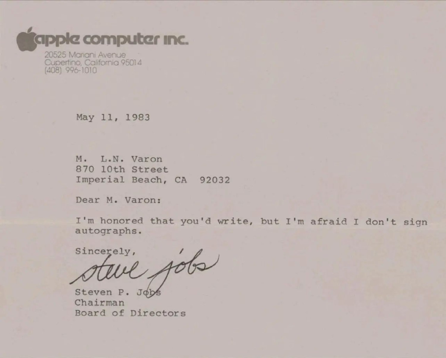 In 1983, Steve Jobs typed this reply to a letter asking for his autograph. This signed letter sold for almost $500,000 at auction.