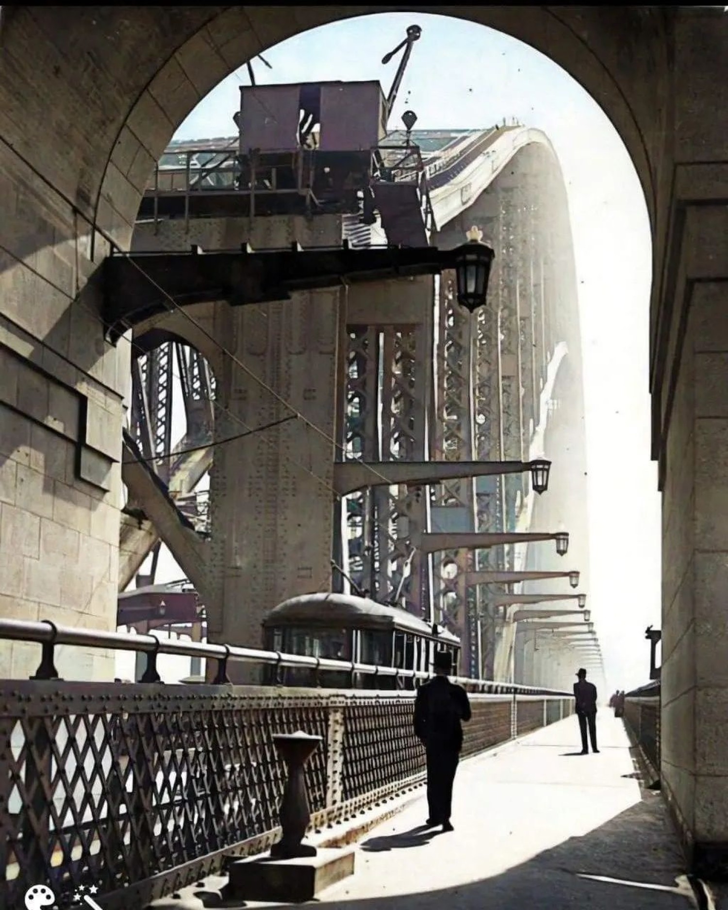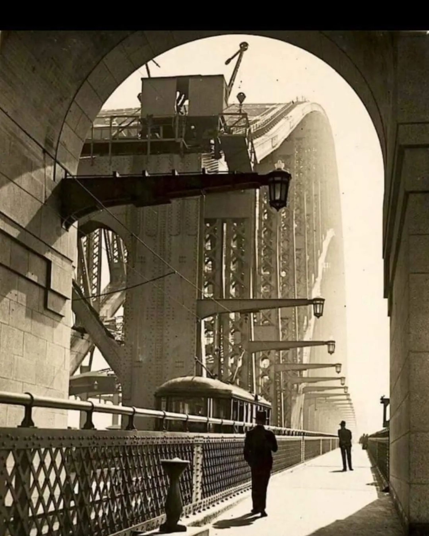 A 1932 photo-essay on the shapes incorporated in the Sydney Harbour Bridge from photographer Ted Hood. In the photo is an O-Class tram, a few pedestrians, and a bubbler. Source :Fairfax.