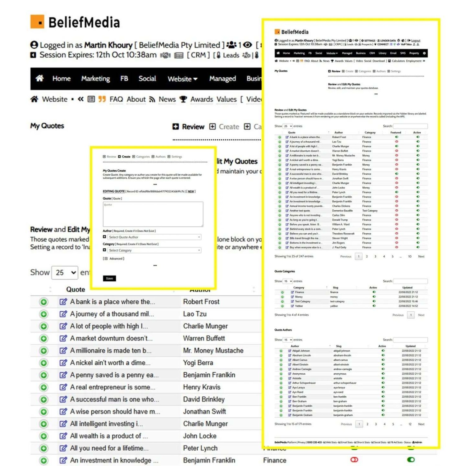 The 'MyQuotes' module is primarily used to support the partner website plugin. We've loaded a few hundred starters, but the idea is that you include your own quotes and then leverage them through the partner plugin and the social module.
