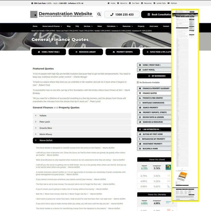 The most 'pointless' page on your website: "My Quotes". The page is simply full of finance, money, wealth, and mortgage quotes. It exists only because it can, and not necessarily because it should.