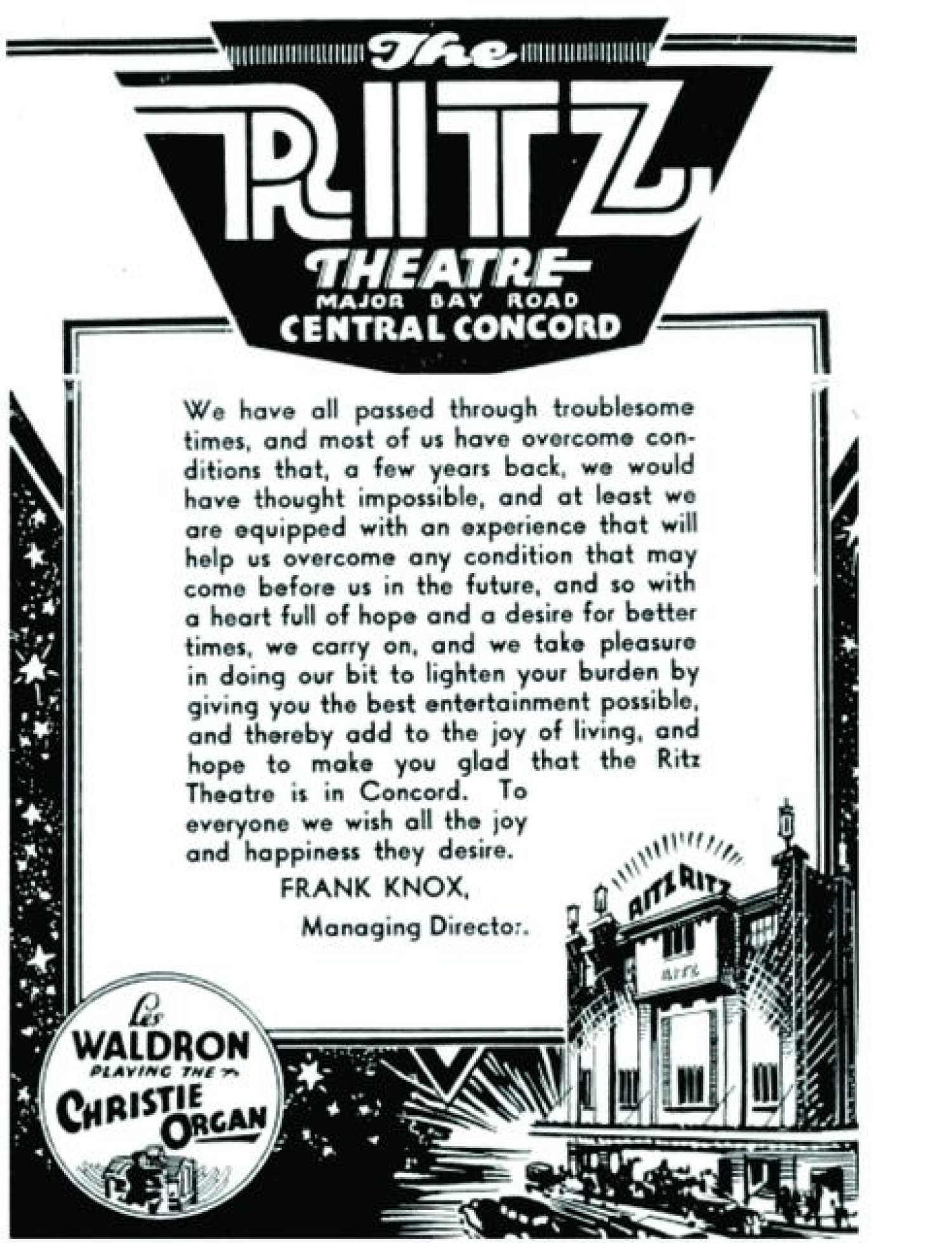 The Central Picture Palace was opened on 26th May 1921 at the corner of Majors Bay Road and Jellico Street, Concord. It was a one level cinema, containing 1,100 seats. In the late-1920s, it was re-built as atwo level cinema, with seating for 1,150, and was re-named Ritz Theatre. It was equipped with a Christie 2Manual/5Ranks organ in 1931. Organists who appeared here include Knight Barnett, Stan Cummings, LesWaldron and Jim Williams. Taken over by Western Suburbs Cinemas circuit in October 1934, the Christie organ was removed to the Strathfield (later Melba) Theatre in 1935.