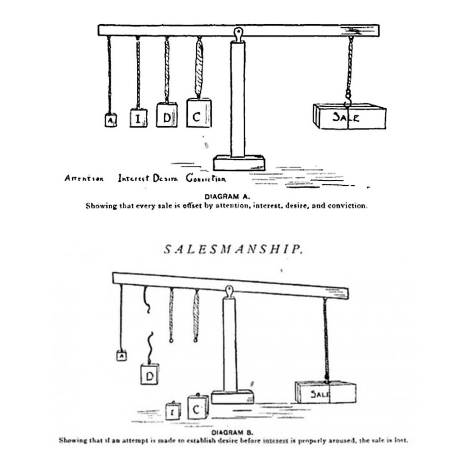 The 1904 magazine "Salesmanship" says that "... a sale of any kind has four essential parts: Attention, Interest, Desire, and Conviction. Take these in their proper order. Do not mistake polite attention for interest and do not assume when a desire for possession is aroused that conviction has been reached. In loss of sales it is as disastrous as to not close the sale when conviction is reached".
