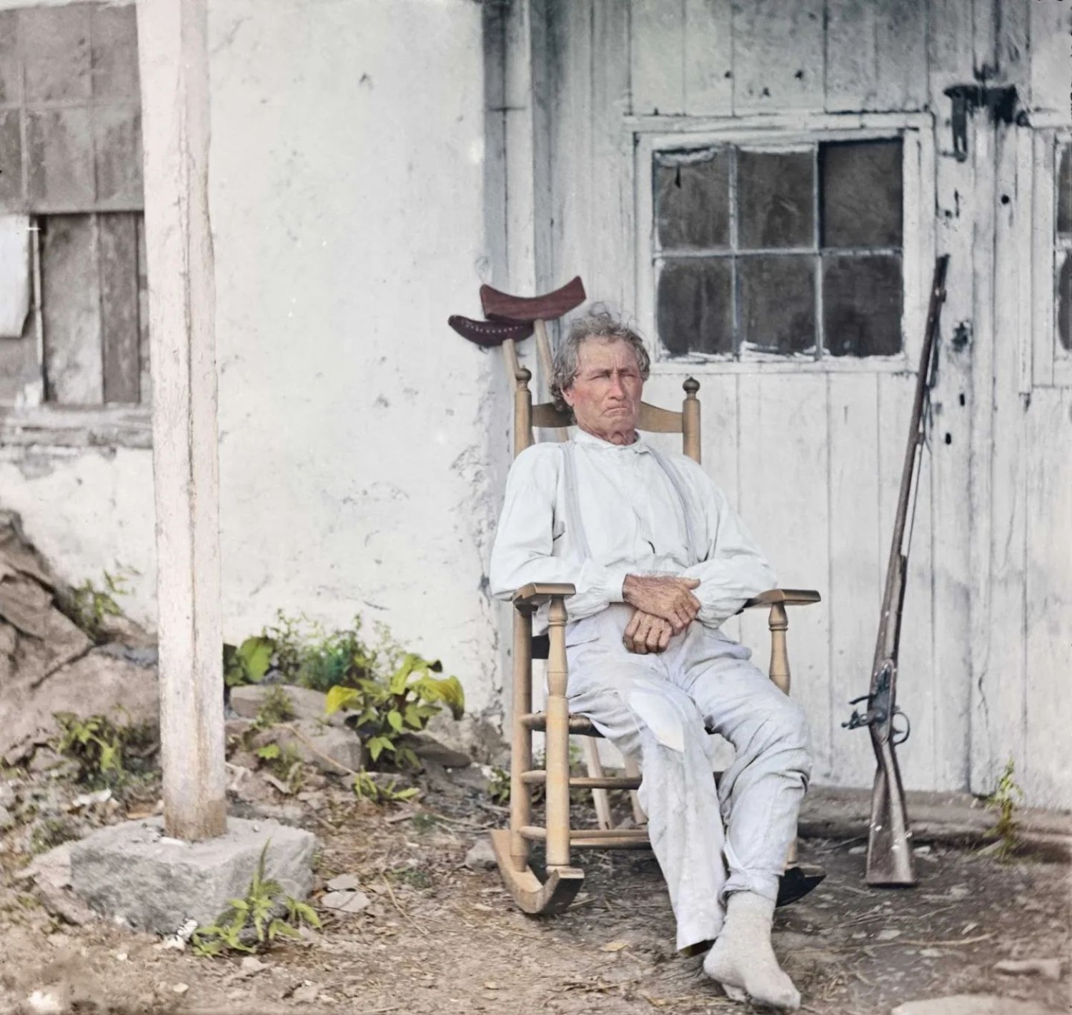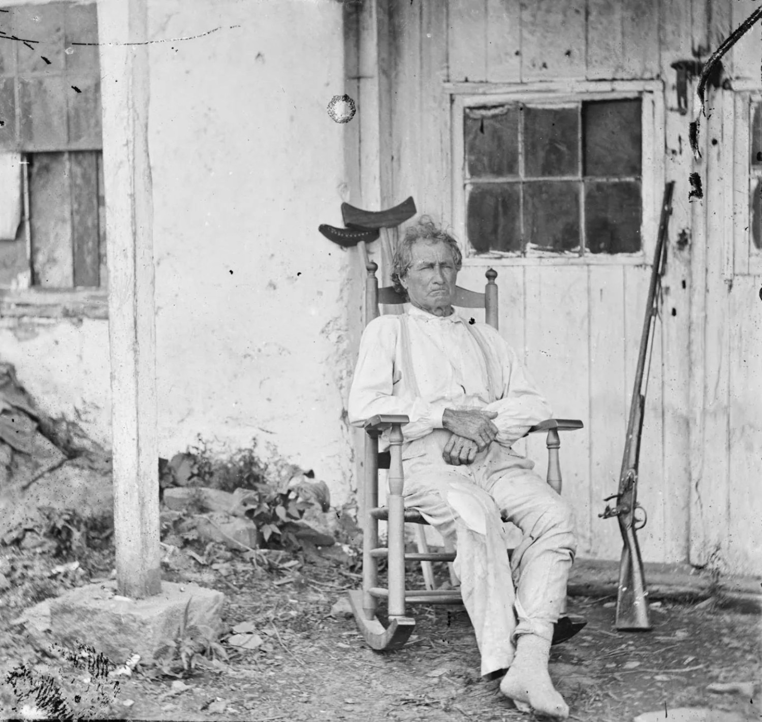 John L. Burns, the "old hero of Gettysburg," with gun and crutches in Gettysburg, Penn., July, 1863.