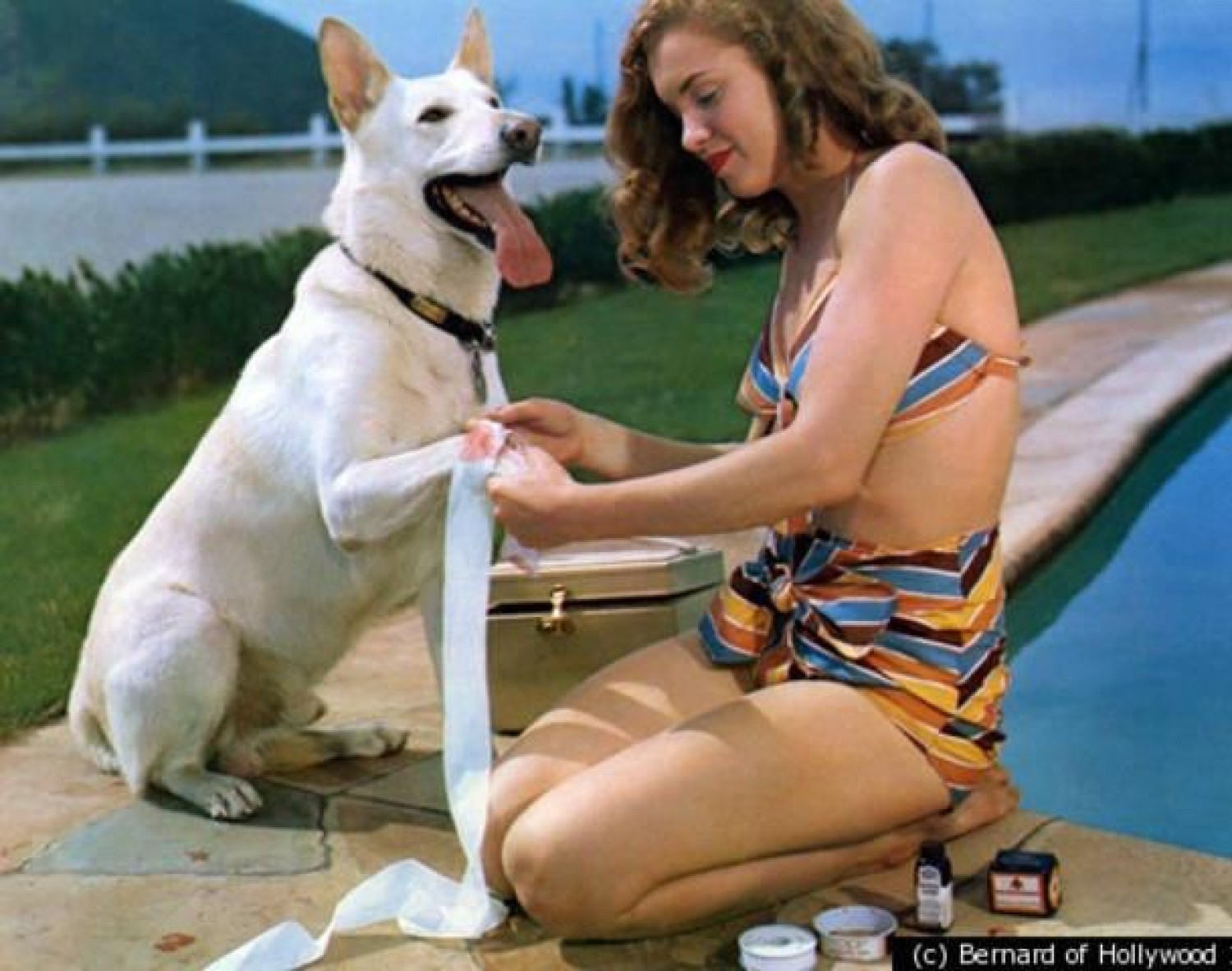 The Marilyn Monroe photo that is said to have started her path to celebrity as revealed by the photographer's daughter, Susan Bernard. The photo was shot by Bruno Bernardon 1946. "Bruno first laid eyes on Norma Jean on Sunset Boulevard right after a dentist appointment," Susan said. "He gave her his business card and she came the very next morning to do the test shots. Those shots were enough to bookher on her first job which was a bandage advertisement, where Norma Jean would be bandaging a dog that same week."