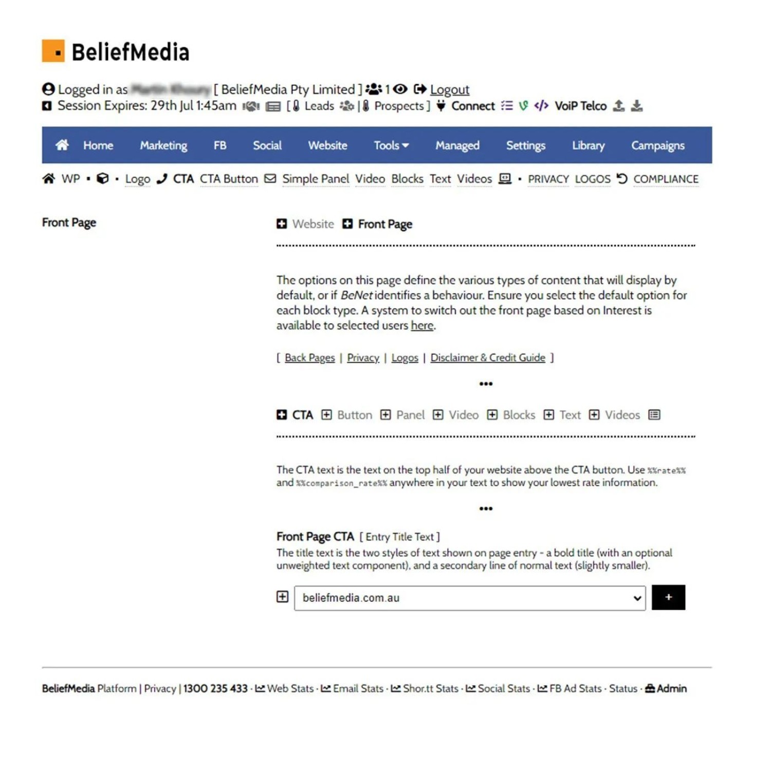 Pictured is the Yabber website front page, with those areas highlighted that are altered in Yabber with a single click, such as the primary CTA text and button, lead magnet subscription panel, announcements, primary video, phone number, logo, general text, and video panel. An agile framework by definition should allow you to alter content without messing around with design, and changes as described should only ever take a few seconds.