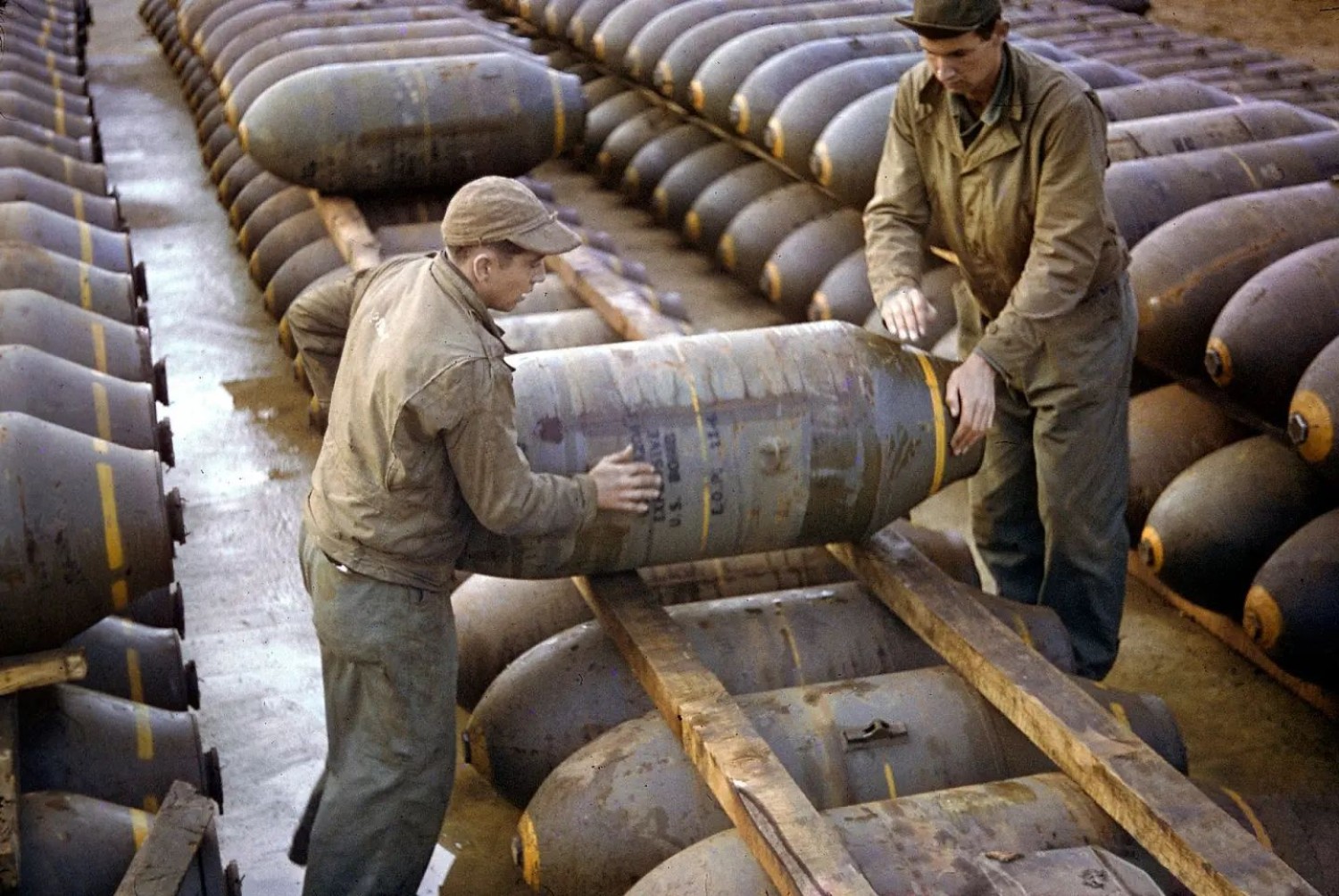Two American soldiers manoeuvring a bomb into its position at an ammo dump, ETO, 1944. During the war the allied forces dropped a staggering total of 3.4 million tons of bombs on the Axis.