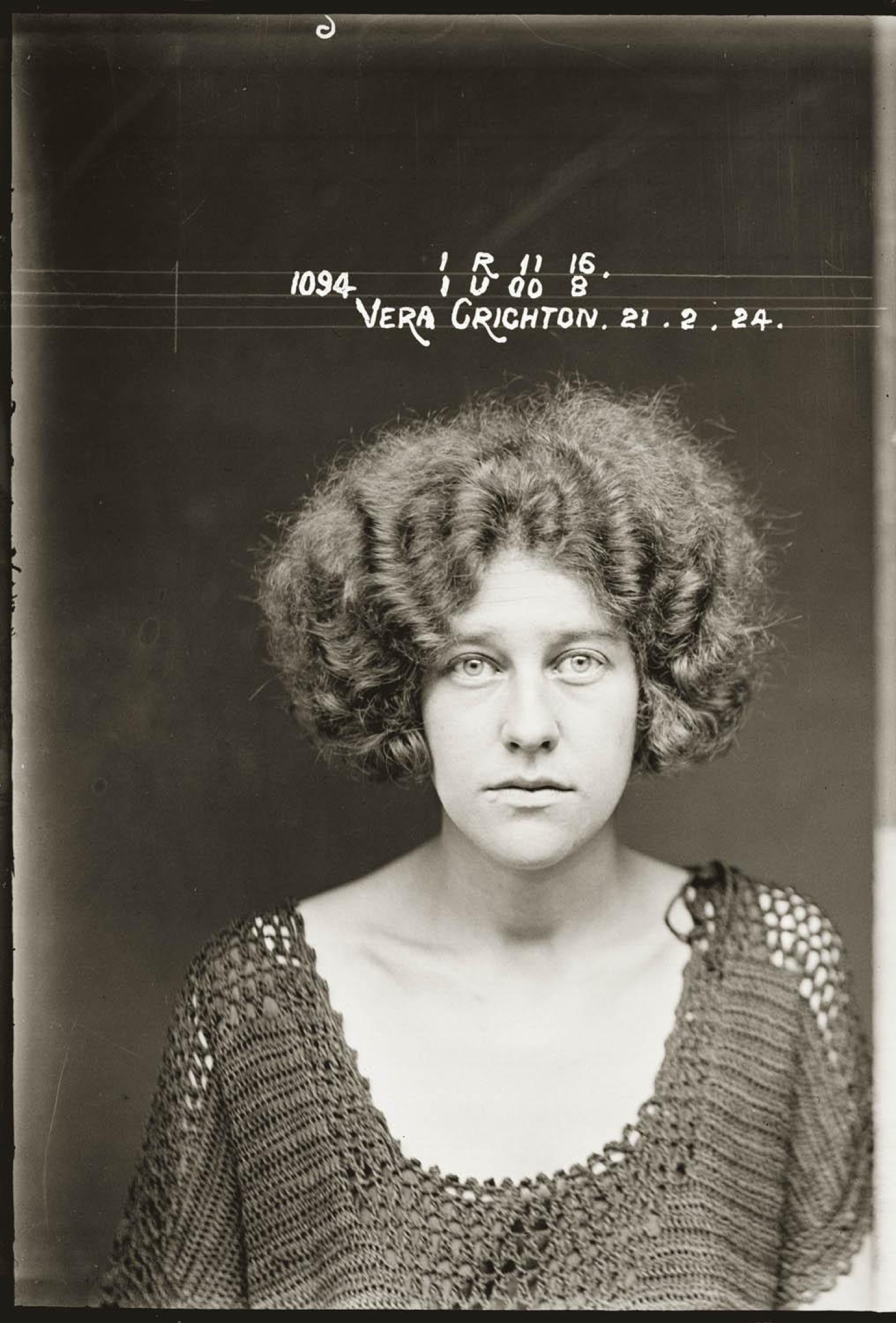 Special Photograph no. 1094. Vera Crichton, 23, and Nancy Cowman, 19, are listed in the NSW Police Gazette 24 March 1924 as charged, along with three others, with "conspiring together to procure a miscarriage" on a third woman. Crichtonwas "bound over to appear for sentence if called upon within three years".