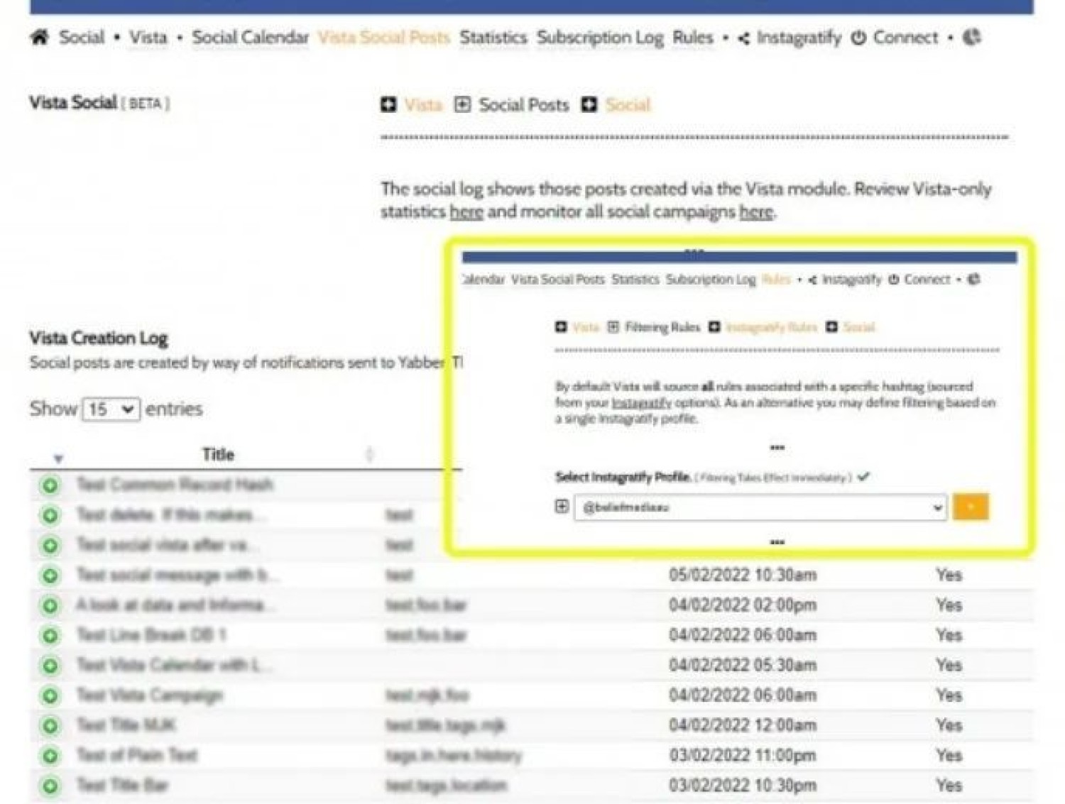 The 'Vista' tool is just one of many Yabber social features. For example, this post is written on Instagram but filleted to various social networks on the basis of post hashtags - it'll even send as a formatted post to a social media archive on your website.