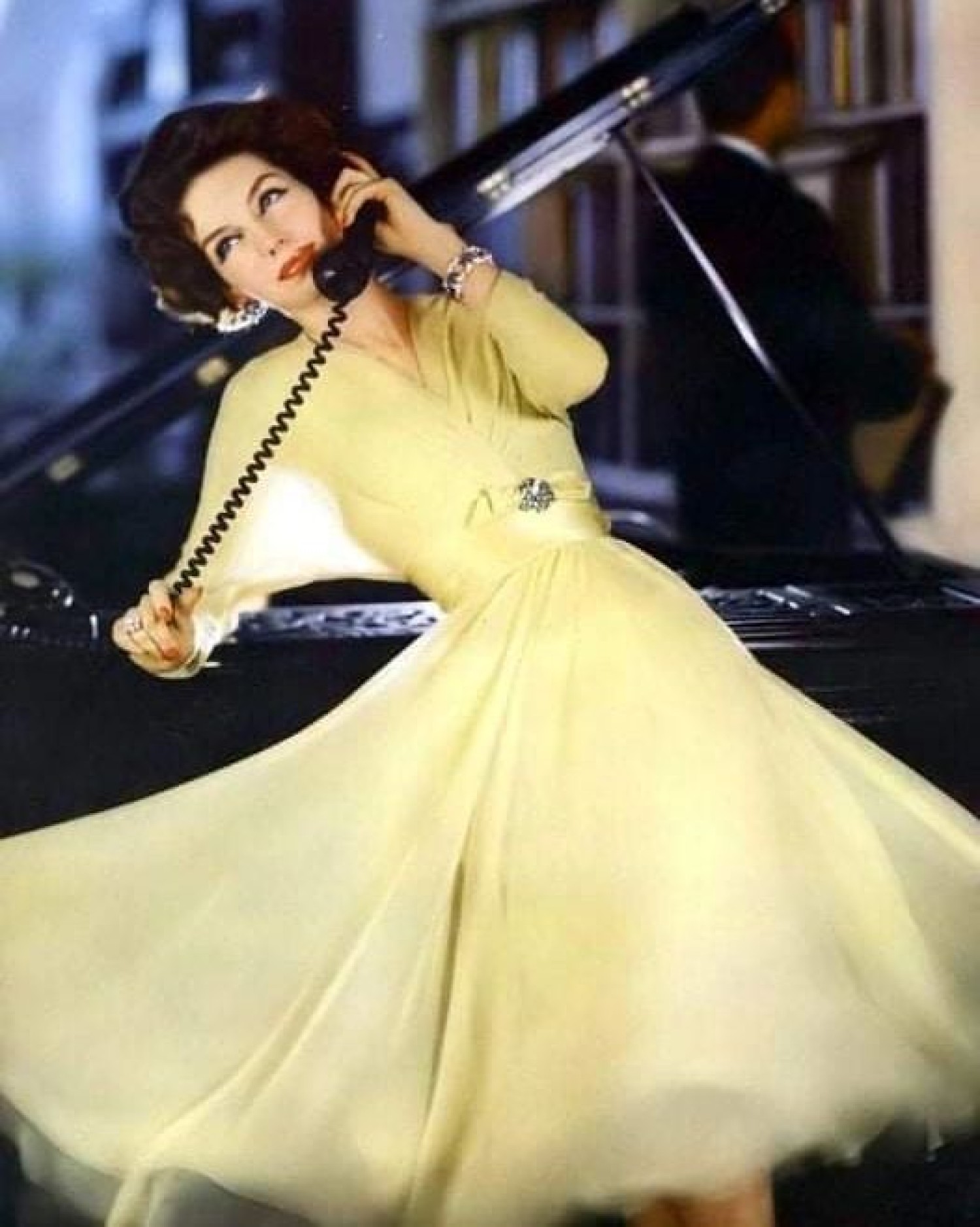 Yellow silk chiffon dress with yellow satin waistband by Philip Hulitar, diamond jewelry by Schlumberger of Tiffany, Vogue, June 1, 1957.