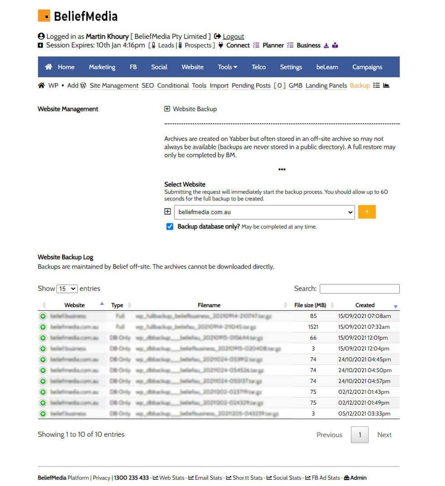 The backup service provided by Yabber creates a zipped backup of your entire website installation (core files and database) and is created in a non-public directory and then synced with our office server for the offsite storage (and then removed). If a restore is required this is created by our team at the click of a button (with a restore function to be added soon). In some cases we can sync the backup to your Microsoft cloud OneDrive storage.