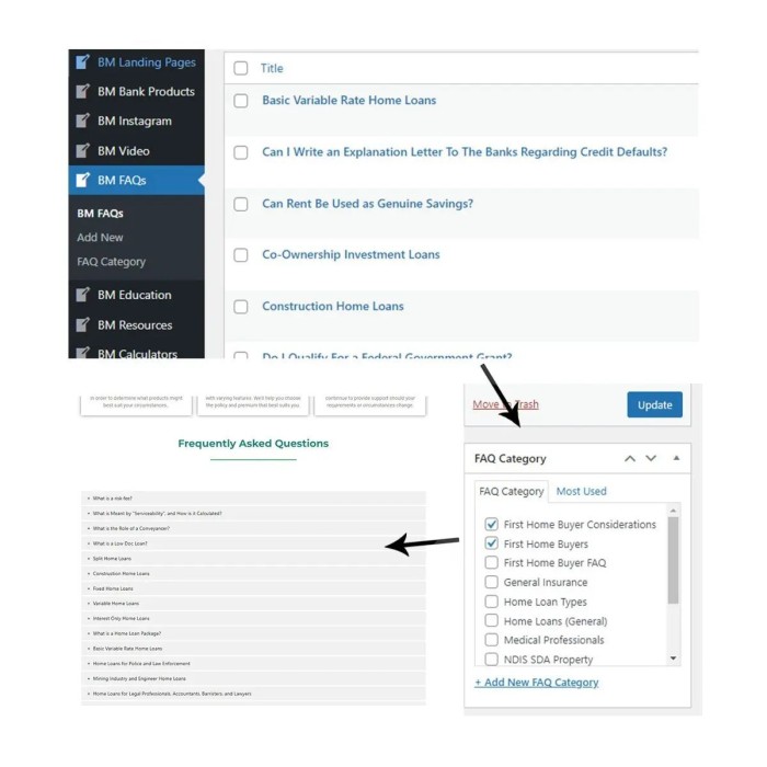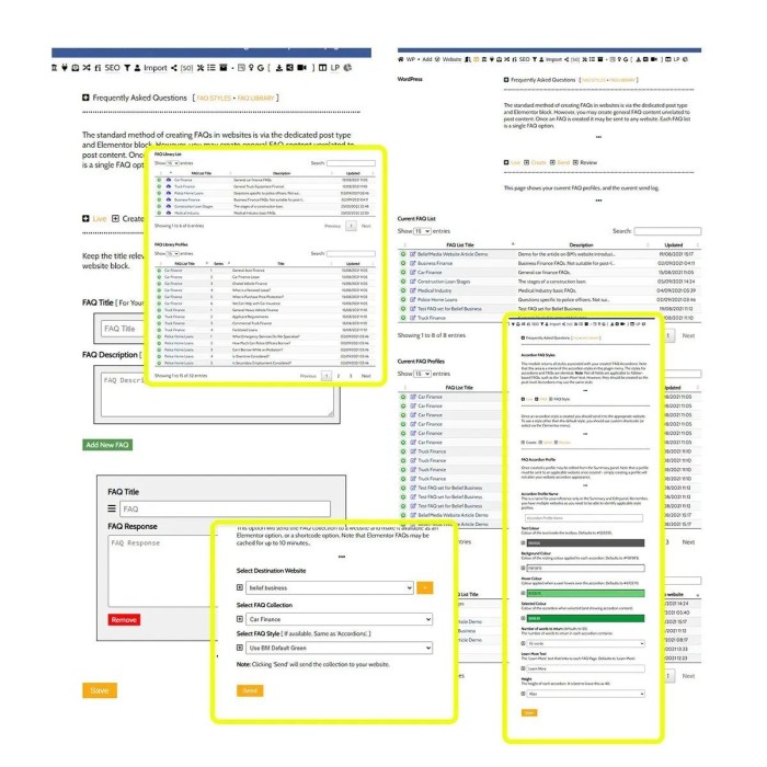 FAQ blocks are created in two different ways; via the category associated with an FAQ post type, and a general free-text style of content block created in Yabber (not associated with the FAQ post type).