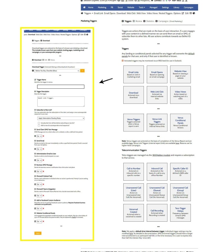What is a trigger? A trigger is an action that causes another action. In your CRM Kanban Board, moving a task from one stage to another will trigger automated tasks, emails etc., and used as part of your digital marketing, a trigger is a *user* action that causes other 'similar' actions to take shape. Again, a common feature in virtually all email software (including ours) is a trigger that fires when a user clicks on a link (or simply opens the email). Yabber triggers can send other emails, alter email subscriptions, or send a text message, and with advanced use, the action can create tasks, shape conditional content, or send webhooks.