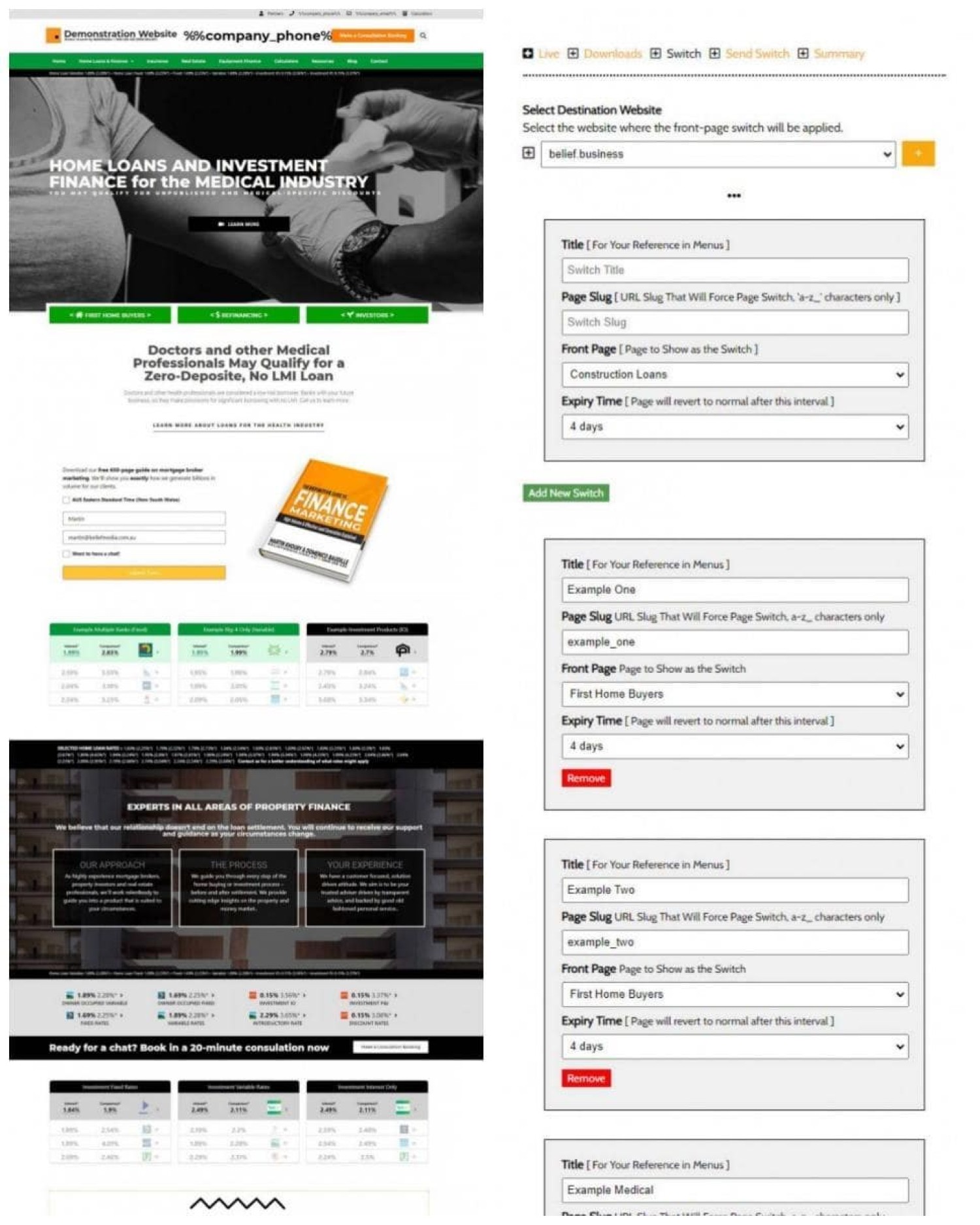 The 'Switch' facility provides relevance, and higher-converting funnel pathways. The 'expiry' iron can set the front page to show for only a period of time before the user defaults back to the extremely powerful conditional framework.