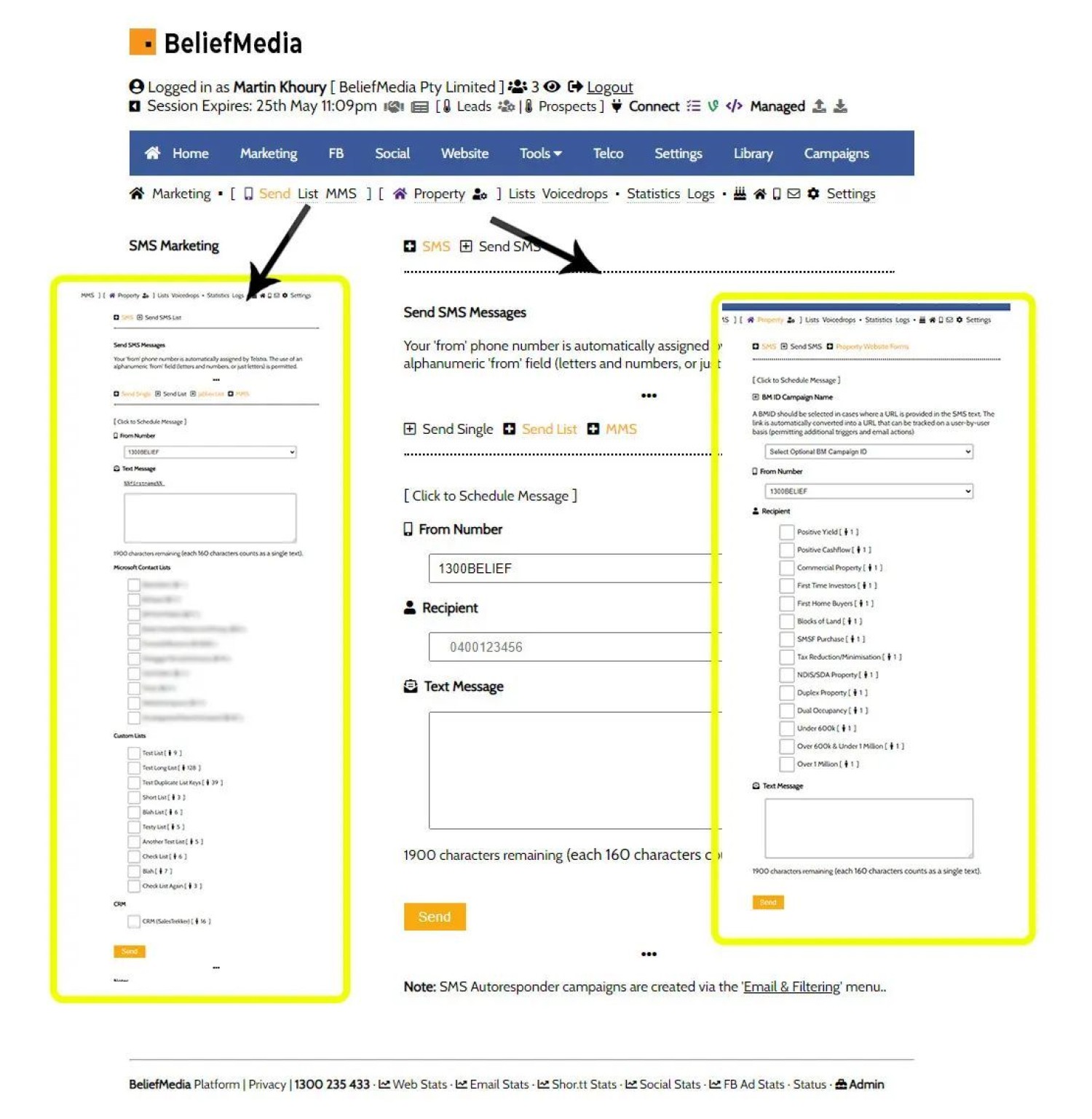 The system is fully integrated with other modules, such as website forms, landing pages, and VoIP Telco (the only system of its kind in Australia). The system supports custom alphanumeric numbers, stop messages, email replies, and full statistics. There's also a property module (and website subsciptions block), birthday panel, and an automated RBA SMS feature.