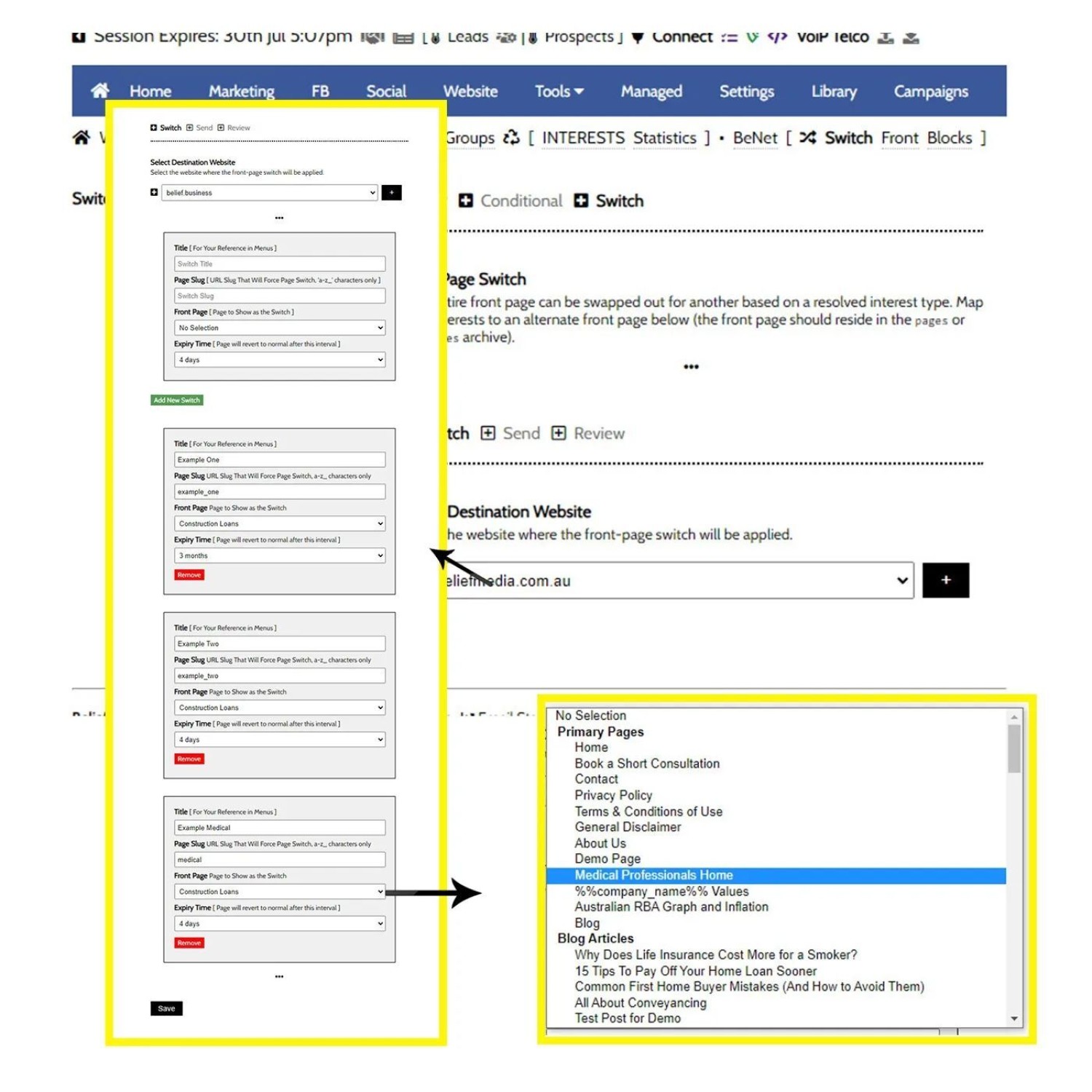 The Switch module takes this conditional method one step further and completely swaps out the front page for another. It does this in one of two ways: resolved borrowing objective/industry; or based on an entry slug (part of the URL). The front page then swaps out for another for that *specific* user, and it stays that way.