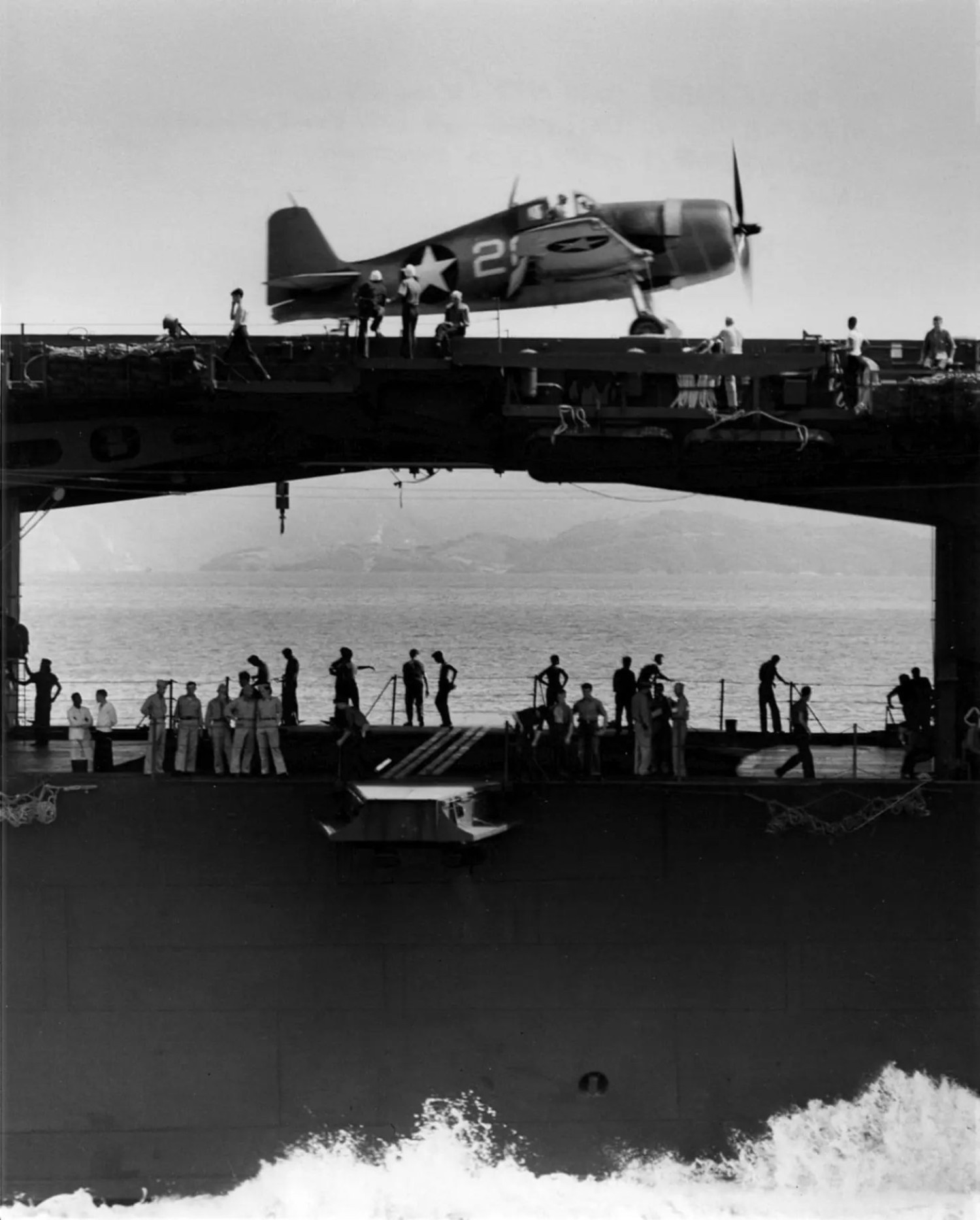 Starboard side view of the carrier Yorktown (Essex-class) with an F6F-3 Hellcat fighter of VF-1 on the fight deck above the athwartship hangar deck catapult, June 1943.