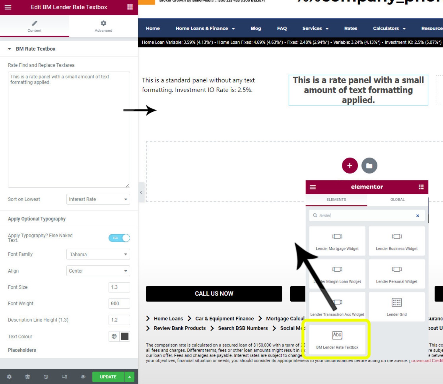 Pictured: Search for the 'BM Lender Rate Textbox' in Elementor, drag into Elementor, and apply the text. Optional text styling may be applied.
